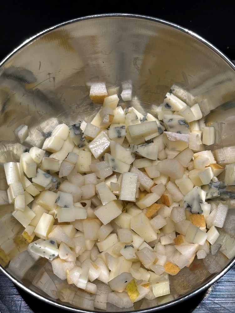 Gaudu i gorgonzolu narežite na kockice jednake veličine kao i krušku pa sve zajedno izmiješajte u manjoj zdjelici.