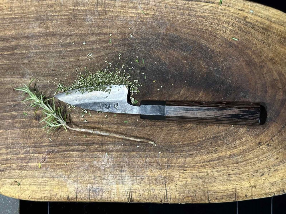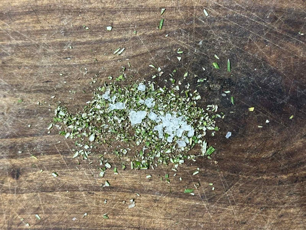 Na kuhinjskoj dasci oštrim kuhinjskim nožem usitnite iglice s pola grančice ružmarina (cca jedna čajna žličica usitnjenog svježeg ružmarina). Dobiveni usitnjeni ružmarin izmiješajte s trećinom cvijeta morske soli.