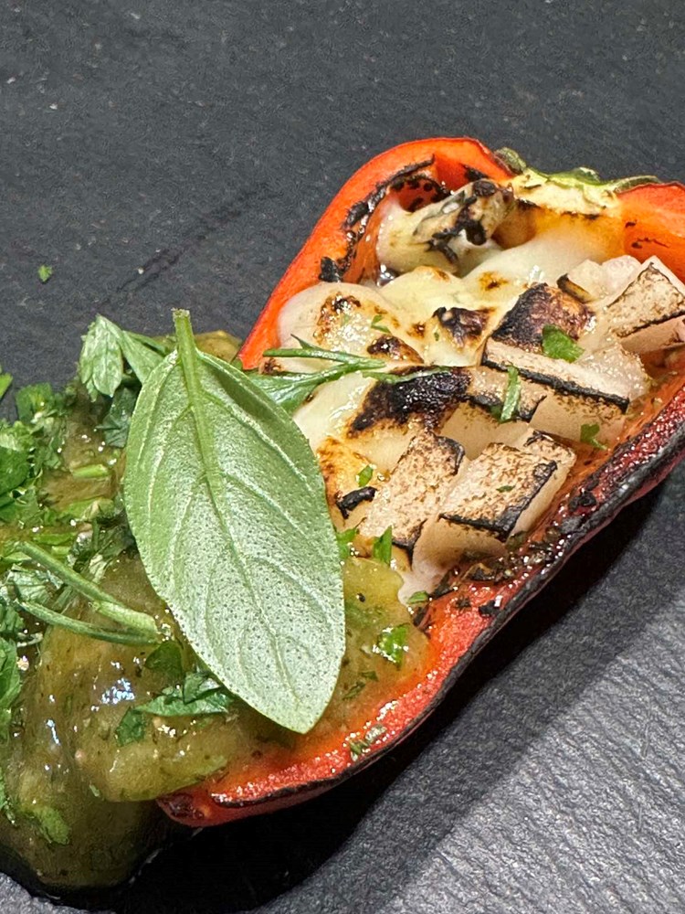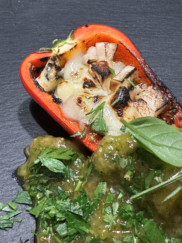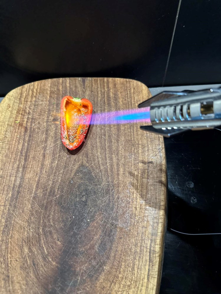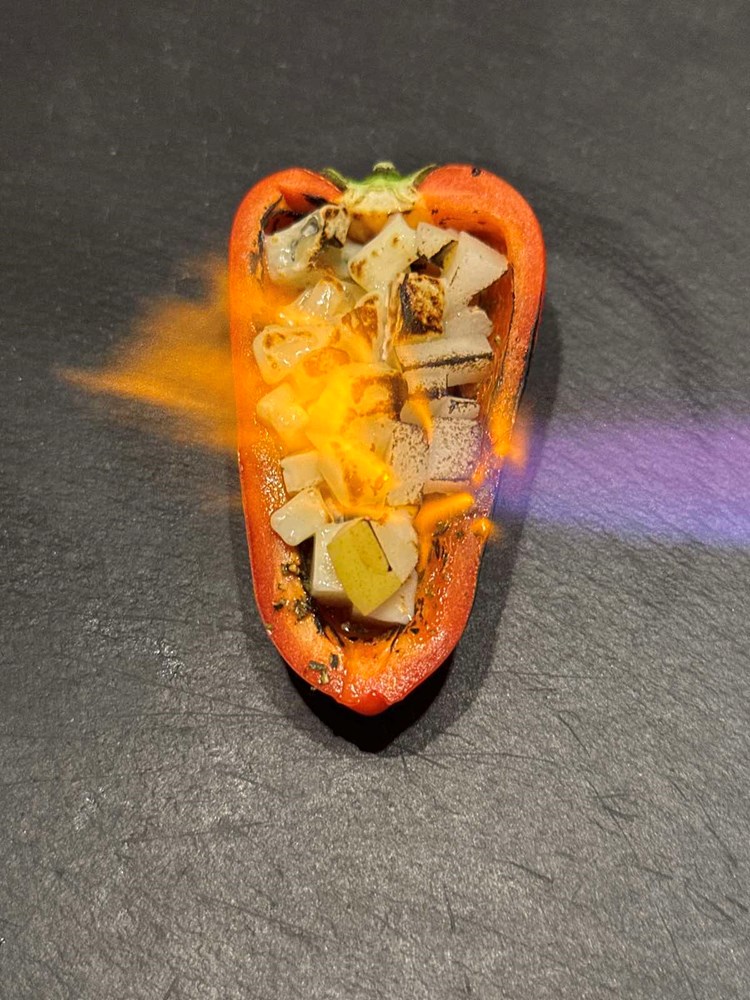Onaj sir i krušku na kockice koji ste napunili u papriku, plamenom džepnog brenera površinski zapalite samo da sir omekša i zajedno s kruškom mjestimice dobije smećkaste tonove (cca 3 do 4 sekunde).