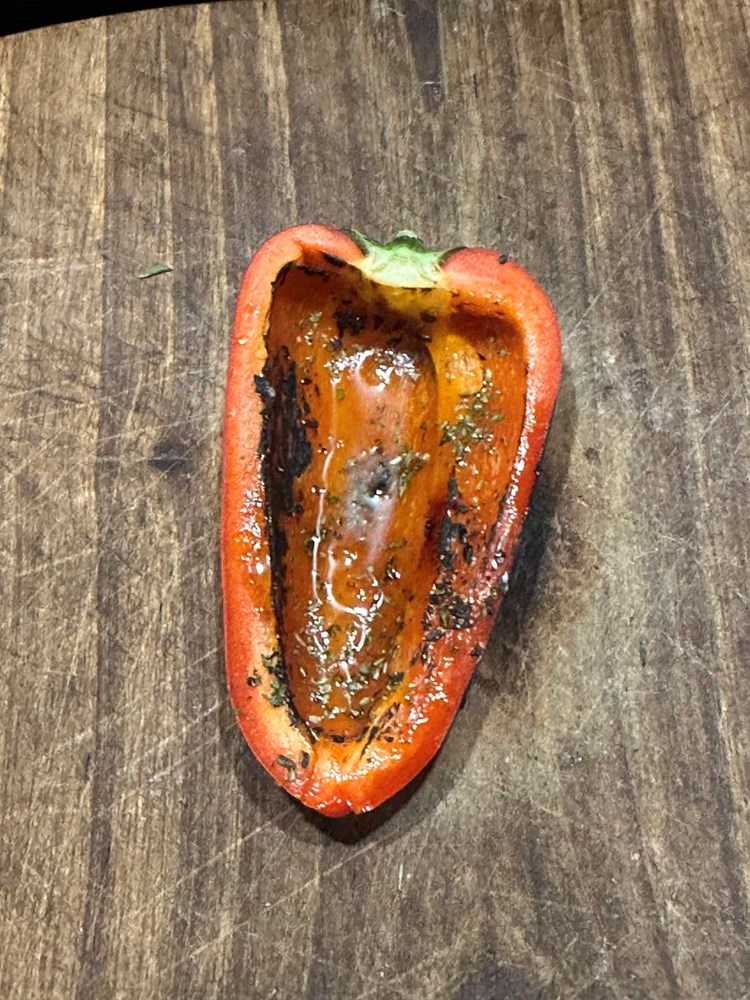 Unutrašnju stranu razrezane paprike namažite medom, usitnjenim ružmarinom i cvijetom morske soli. Zatim plamenom kuhinjskog ili džepnog brenera tu unutrašnjost malo zapalite cca 5 sekundi da dobije mjestimice tamne tonove, ali ne previše (vidi fotografiju).