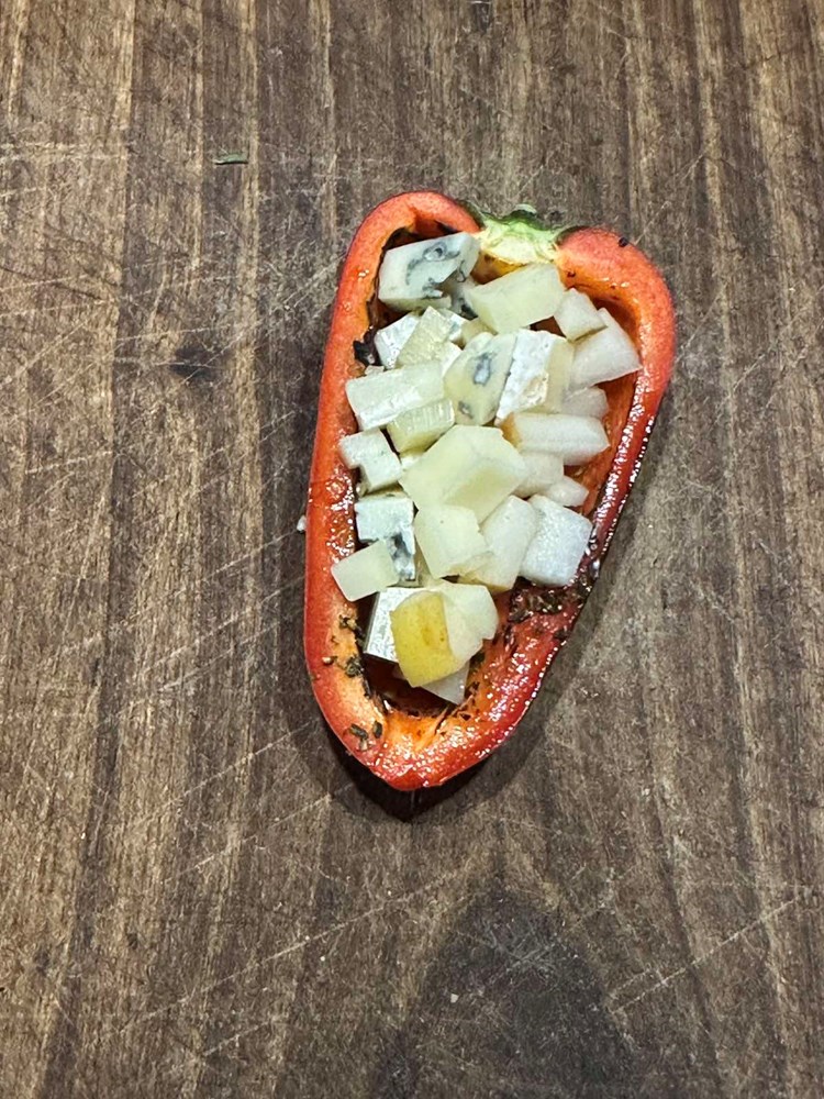 Unutrašnjost zapaljene paprike ispunite kockicama kruške, gorgonzole i gaude.