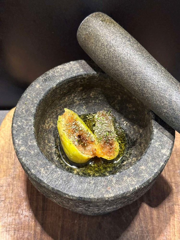 U kameni mužar ubacite pola svježe i zrele smokve, pola jušne žlice maslinovog ulja, prstohvat soli i dva prstohvata svježe mljevenog crnog papra, dodajte i prstohvat usitnjenog ružmarina. Sve ovo kamenim štapom mužara izgnječite dok ne dobijete kompaktnu kašicu.