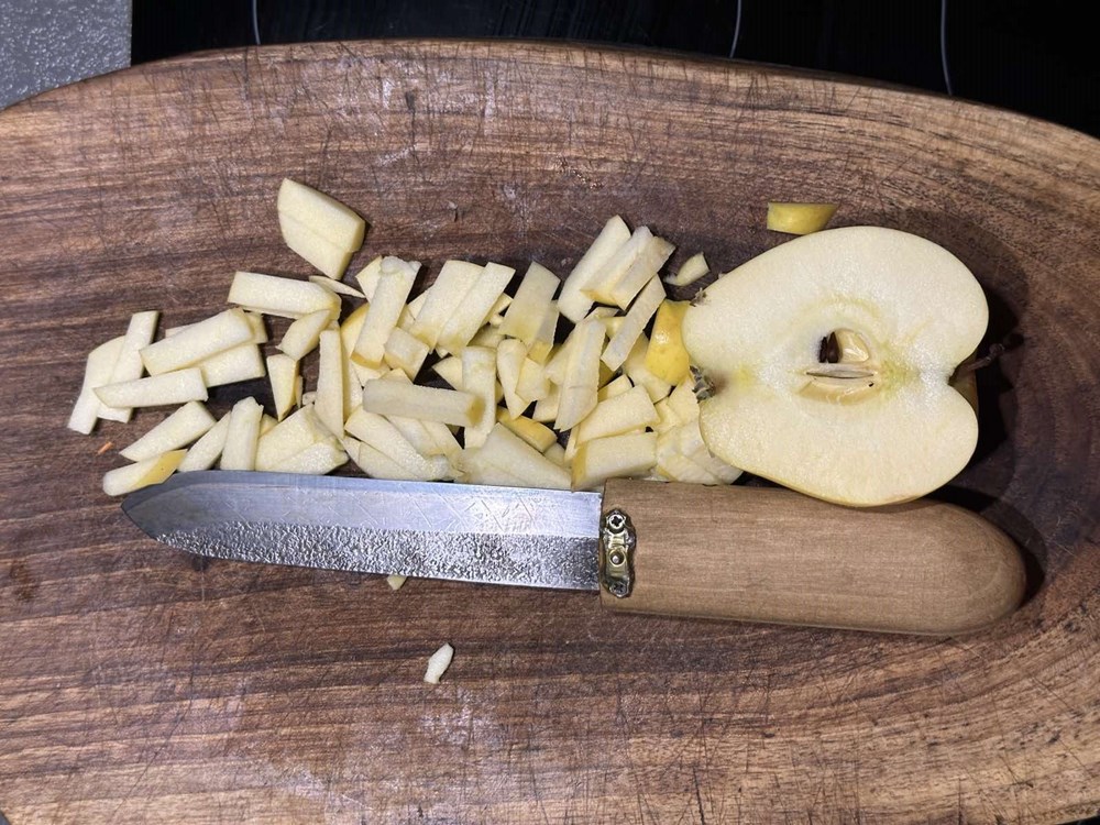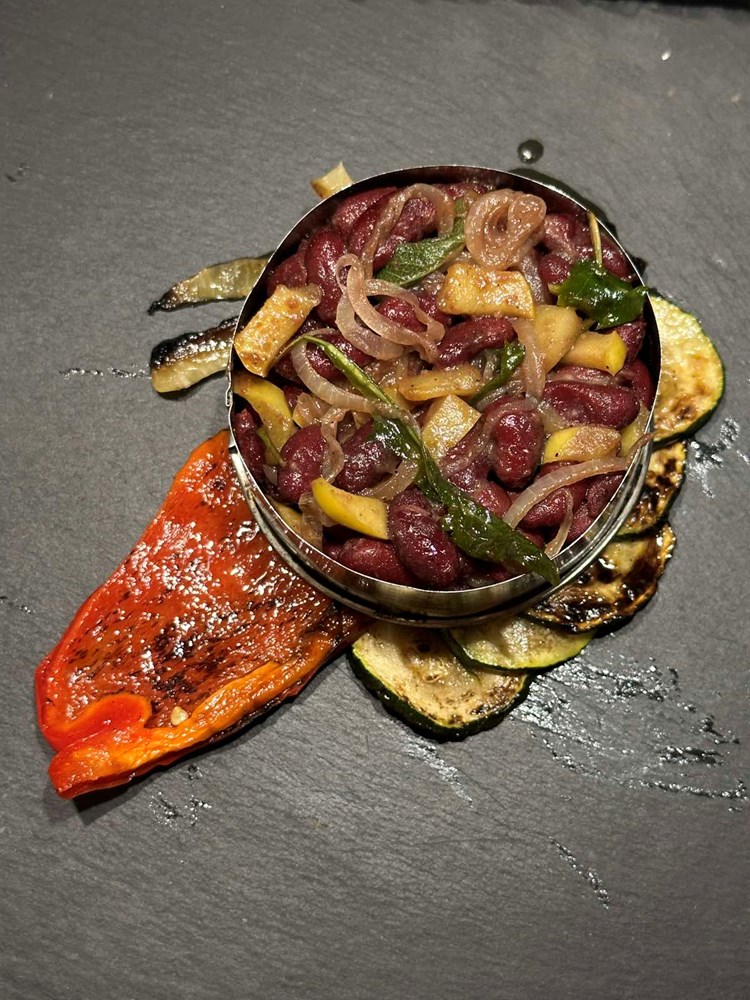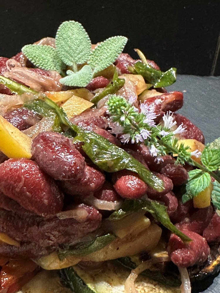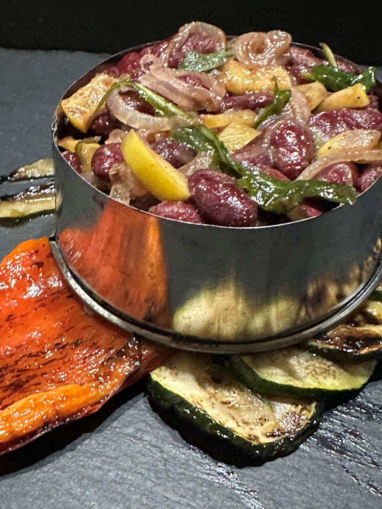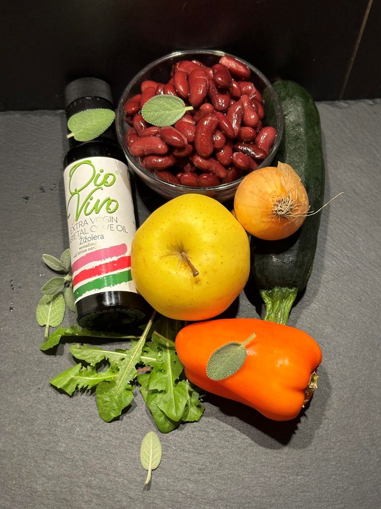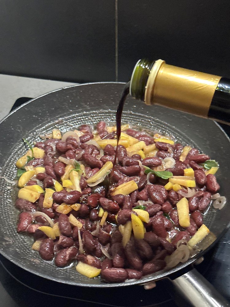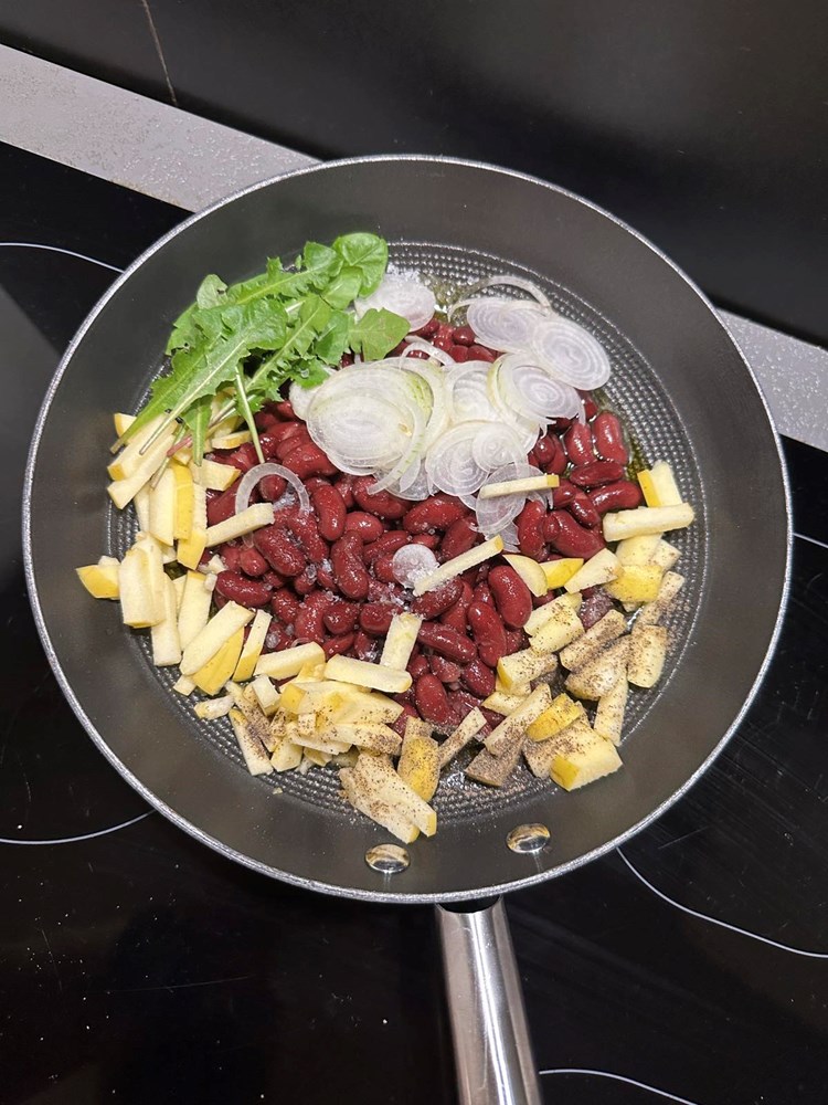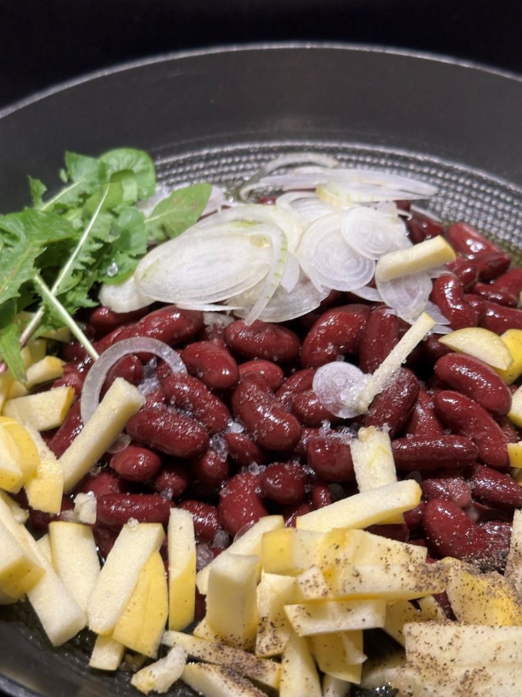 U manjoj tavi na vrelom maslinovom ulju pecite: ocijeđeni smeđi grah iz konzerve, pola jabuke zlatni delišes izrezanu na male kockice veličine graška, listove mladog divljeg radiča maslačka, pola glavice luka narezane na tanke kolutiće, prstohvat soli i dva prstohvata crnog friško samljevenog papra. Uz lagano i konstantno miješanje pržite na srednje jakoj vatri nekih 4 minute pa dodajte zatim 4 manja lista kadulje, smanjite vatru na minimum pa nakon jedne minute laganog prženja ugasite vatru i dodajte pola čajne žličice accetta balsamica i sve još jednom dobro izmiješajte. Maknite tavu od izvora topline i ostavite ju da odstoji nekih pet minuta.