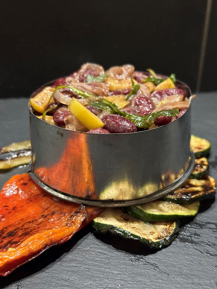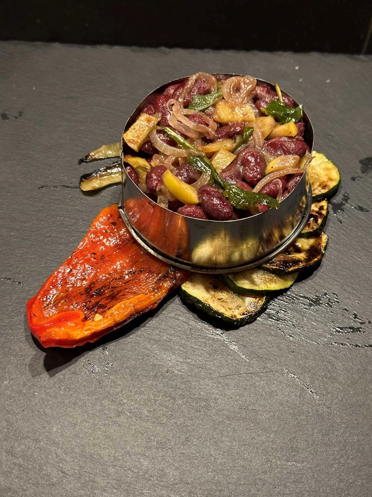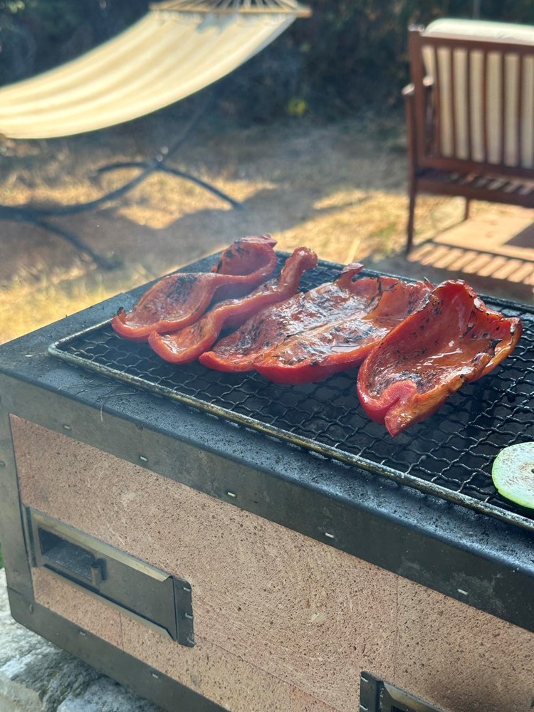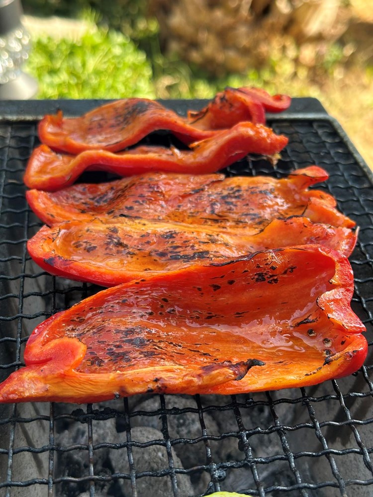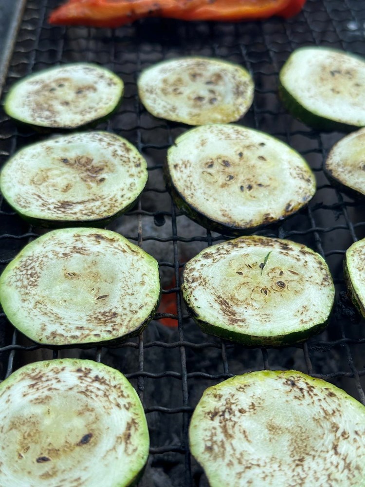 Upalite vatru u roštilju pa kad se stvori žar, na žar stavite peći slatku crvenu papriku razrezanu na pola, i tikvicu razrezanu na kolutiće. Posolite povrće prstohvatom soli i pecite sa svake strane dok se ne stvore mjestimice smećkasti tonovi. Pecite cca 2 minute sa svake strane. Poprskajte s par kapi maslinovog ulja i privremeno odložite na manji tanjur.