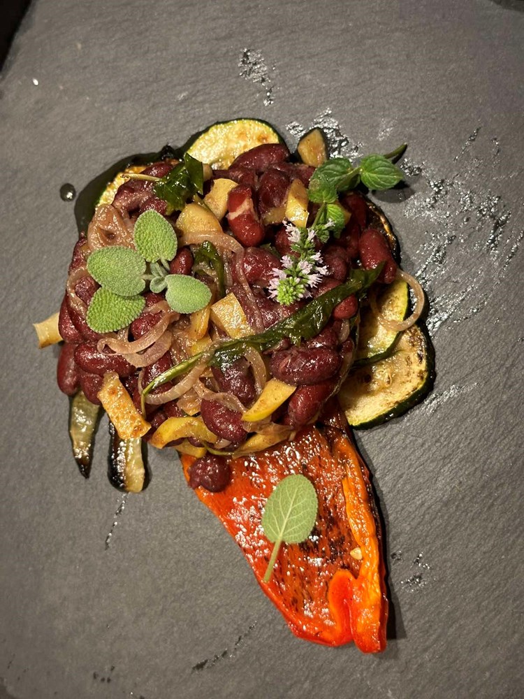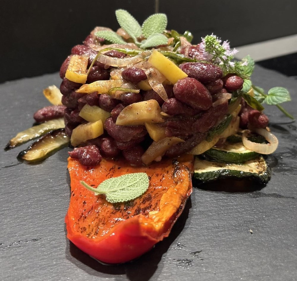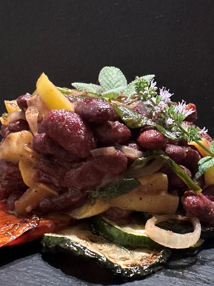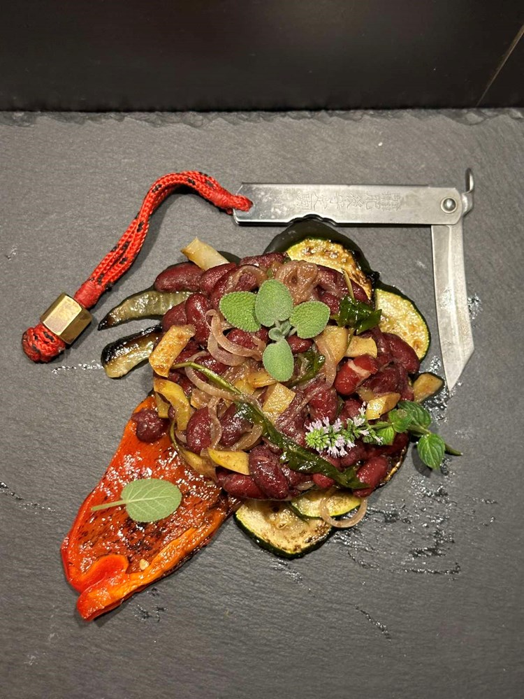 Upalite vatru u roštilju pa kad se stvori žar, na žar stavite peći slatku crvenu papriku razrezanu na pola, i tikvicu razrezanu na kolutiće. Posolite povrće prstohvatom soli i pecite sa svake strane dok se ne stvore mjestimice smećkasti tonovi. Pecite cca 2 minute sa svake strane. Poprskajte s par kapi maslinovog ulja i privremeno odložite na manji tanjur.