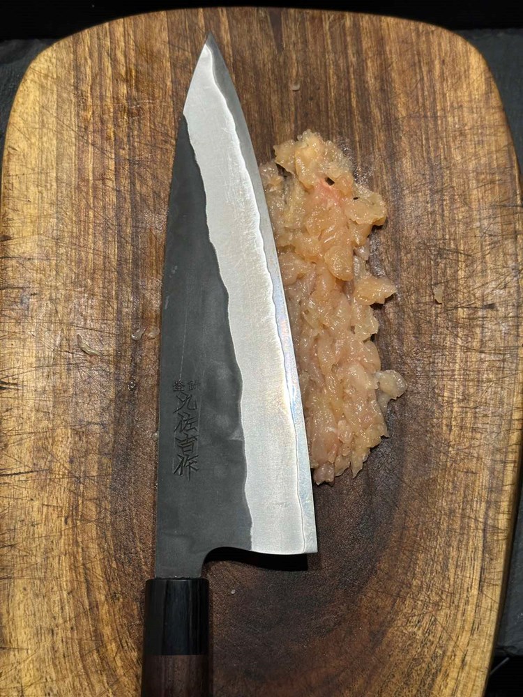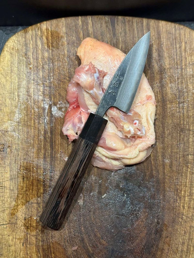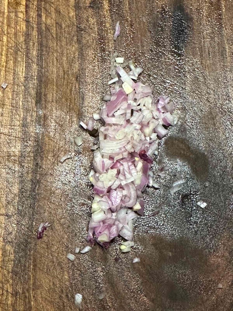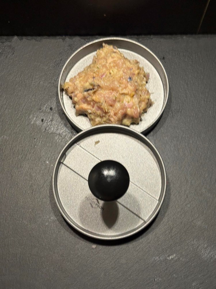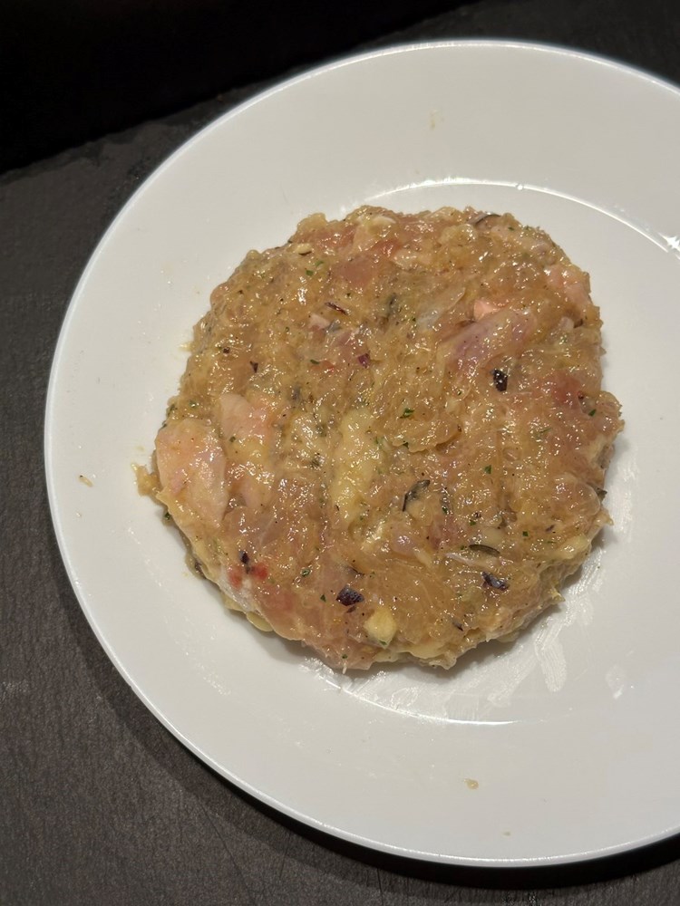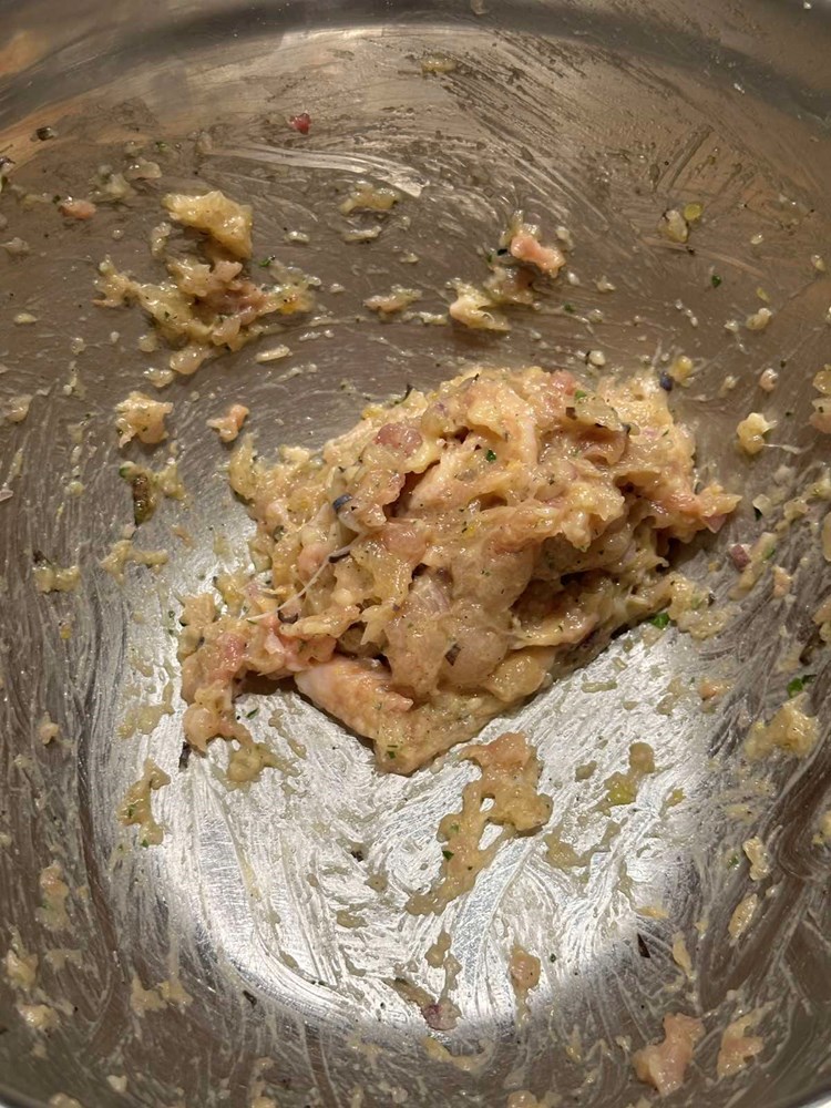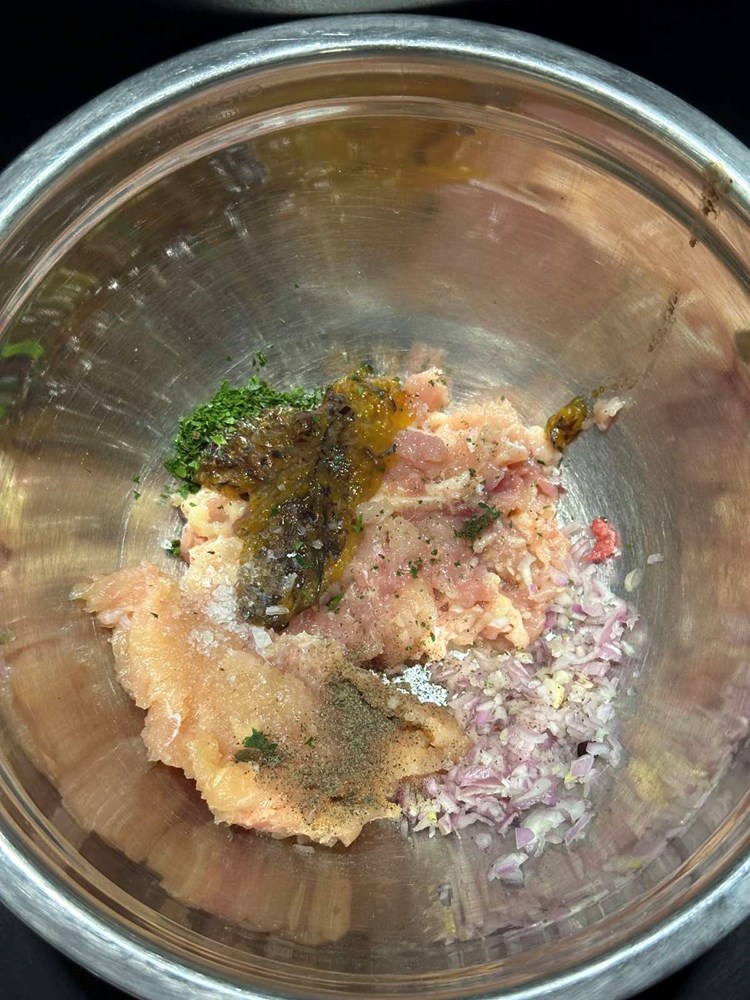 Oštrim kuhinjskim nožem uklonite kost iz pilećeg zabatka i usitnite ga na srednje velike komadiće (cca. kao pola zrna graška) to isto učinite i sa pilećim prsima. Zapamtite: pileća kožica je u ovoj priči bitna jer ispušta masnoću tijekom pečenja, a komadići koji se nađu na vrhu pljeskavice dati će strukturi hrskavost na površini. Ubacite nasjeckano meso u poluokruglu manju zdjelicu.