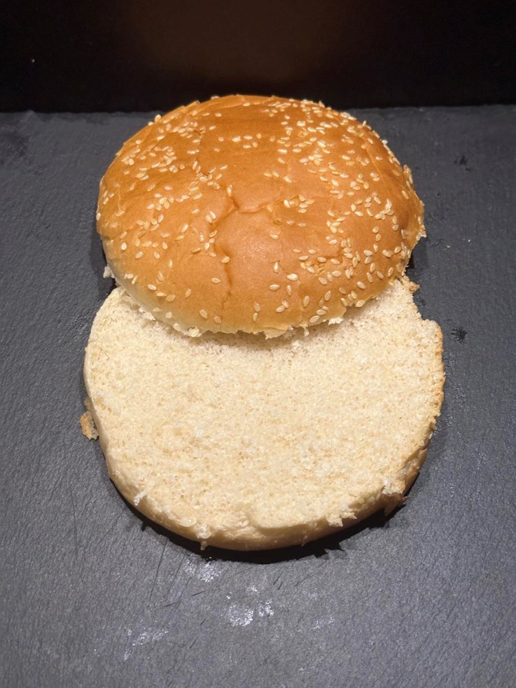 Nakon što ste pileću pljeskavicu okrenuli na drugu stranu, razrežite pecivo za burger i zapecite ga petnaestak sekundi s unutarnjih strana malo na žaru da dobije čvršću koricu i "šmek po dimu i mesu". Maknite zatim pljeskavicu i pecivo sa roštilja....