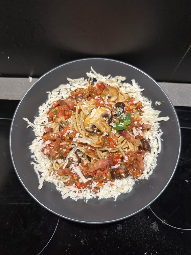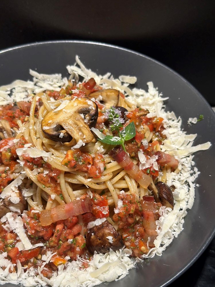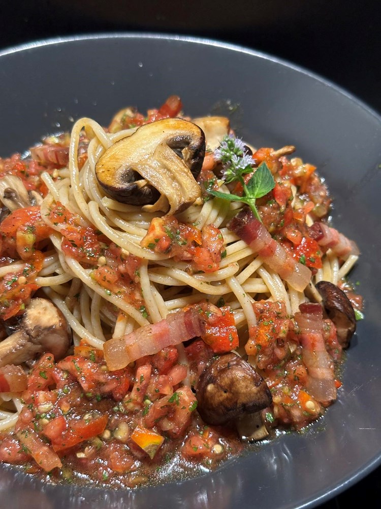 Na dno dubokog tanjura stavite jušnu žlicu vaše "crudo" šalše od pomidora. Na tu šalšu stavite velikom vilicom ili velikom pincetom umotane spaghette. Po spaghettima prospite ostatak "crudo" šalše od pomidora pa zatim pobacajte smeđe šampinjone pržene na masti od pancete i trakice pržene pancete.