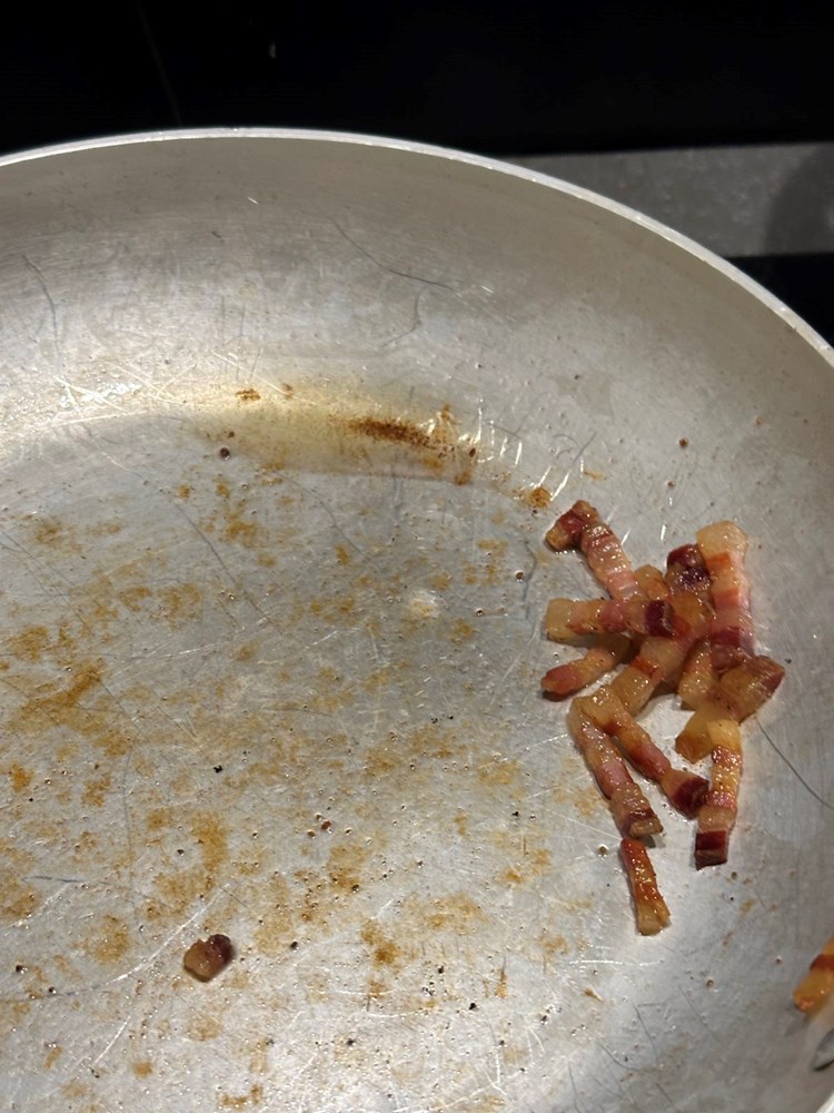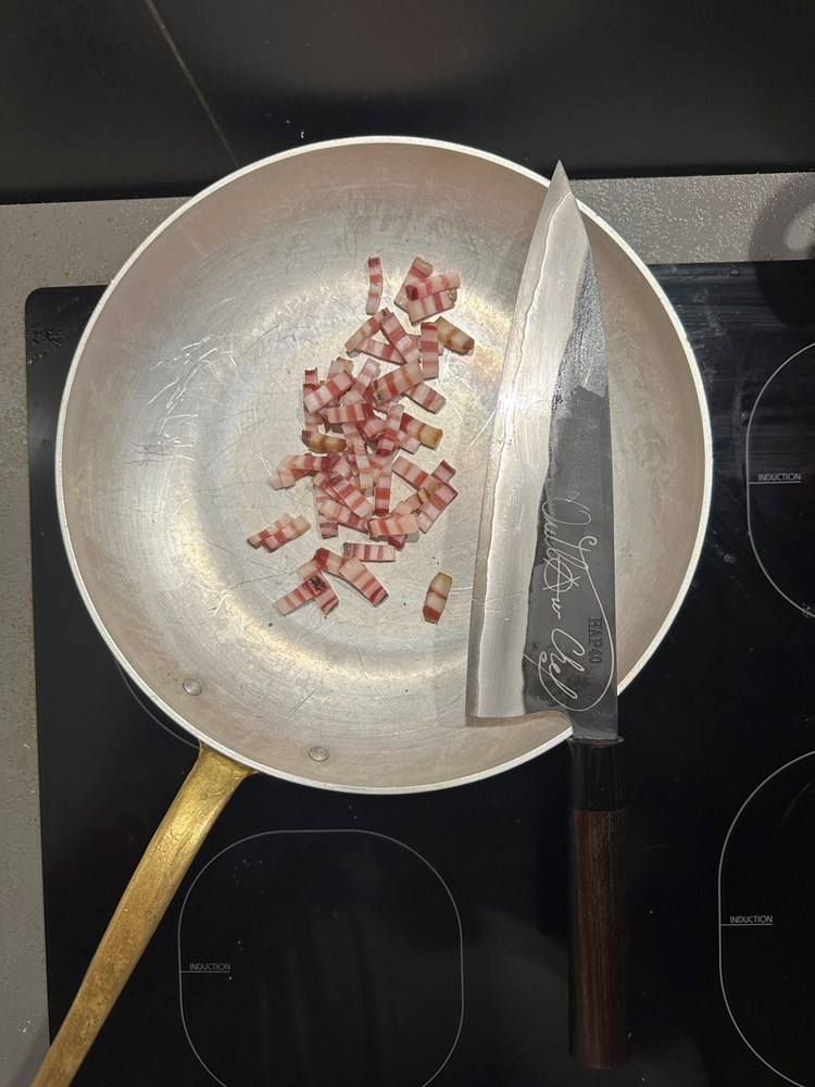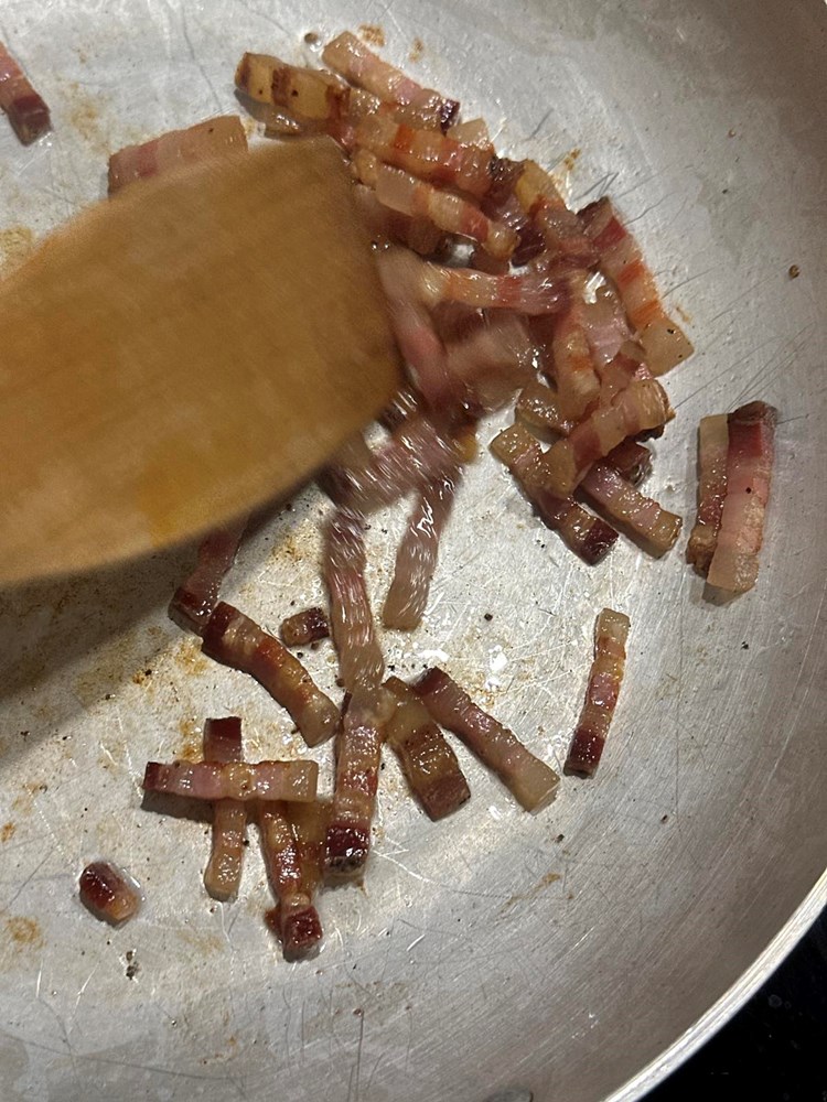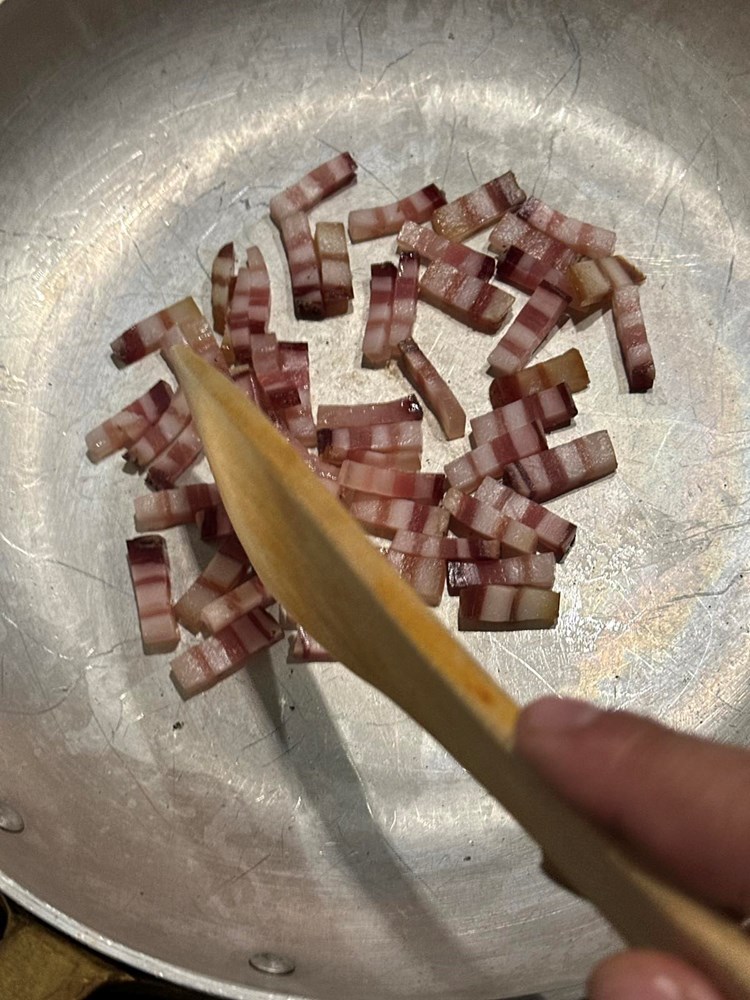 Oštrim kuhinjskim nožem narežite pancetu na tanke trakice. Narezanu pancetu stavite pržiti na zagrijanu suhu tavu. Kad panceta ispusti svoju masnoću u tavu i postane hrskava, izvadite pancetu na manji tanjurić, a njenu otopljenu mast ostavite u tavi.