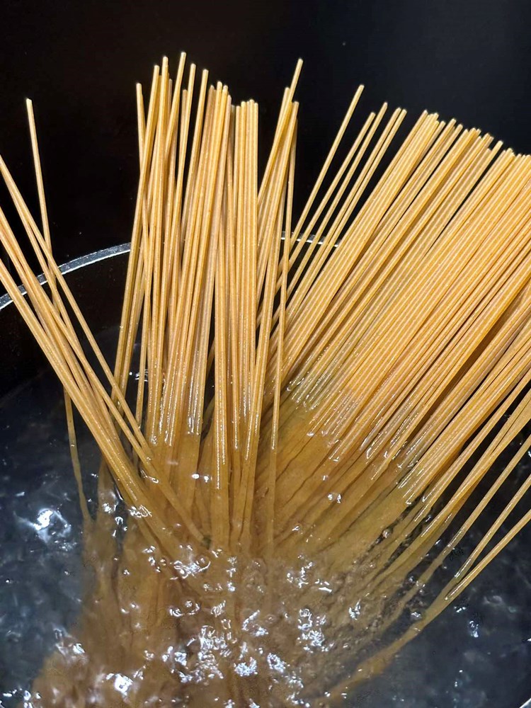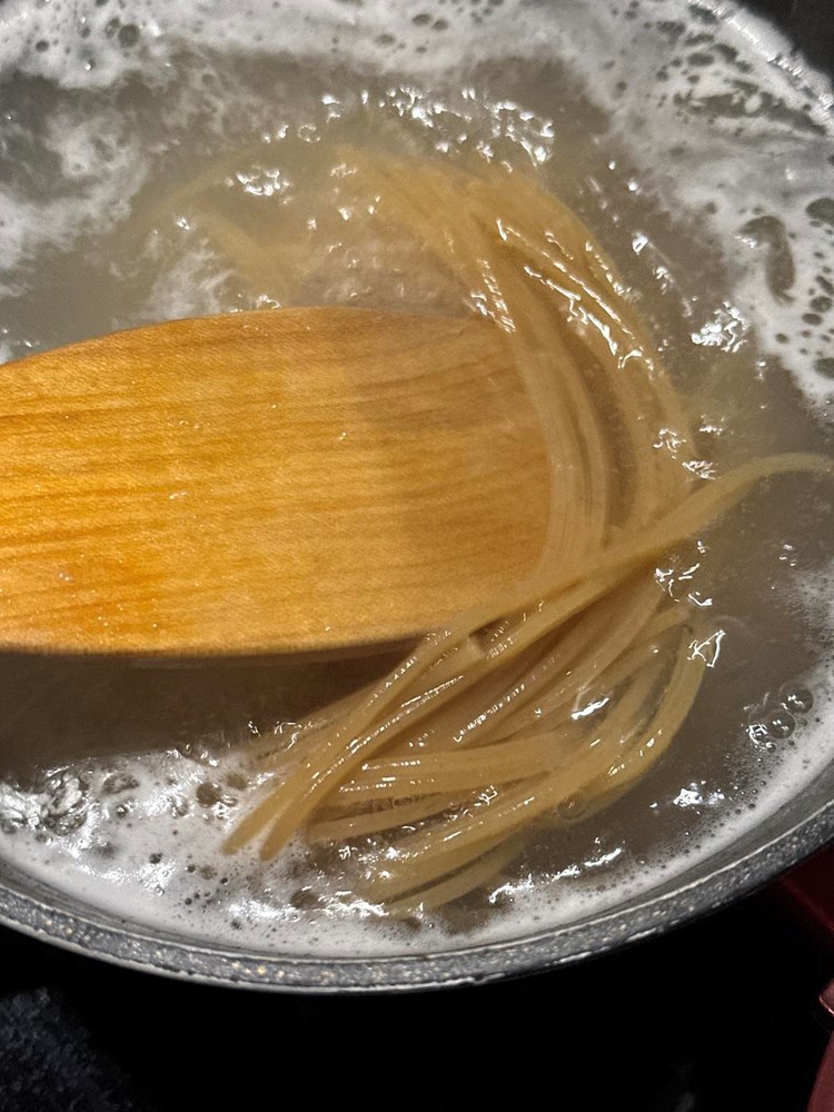 Paralelno kada ste stavili pržiti pancetu u lonac sa slanom i kipućom vodom, ubacite spaghette da se kuhaju. Nakon 8 do 9 minuta procijedite spaghette iz kipuće vode.