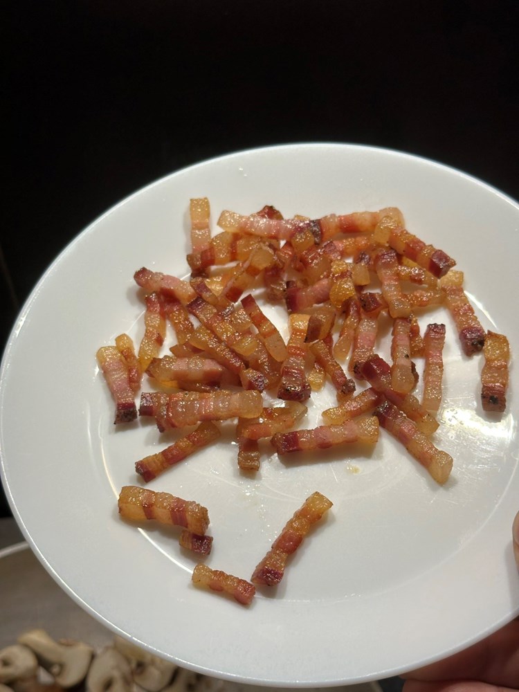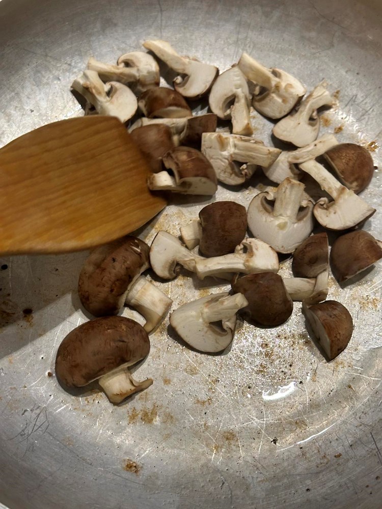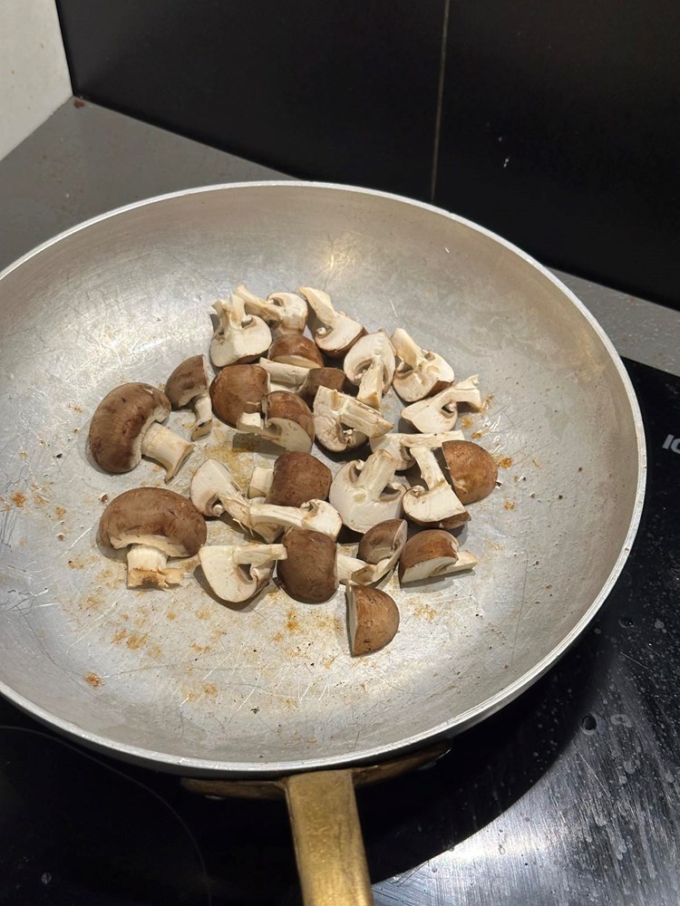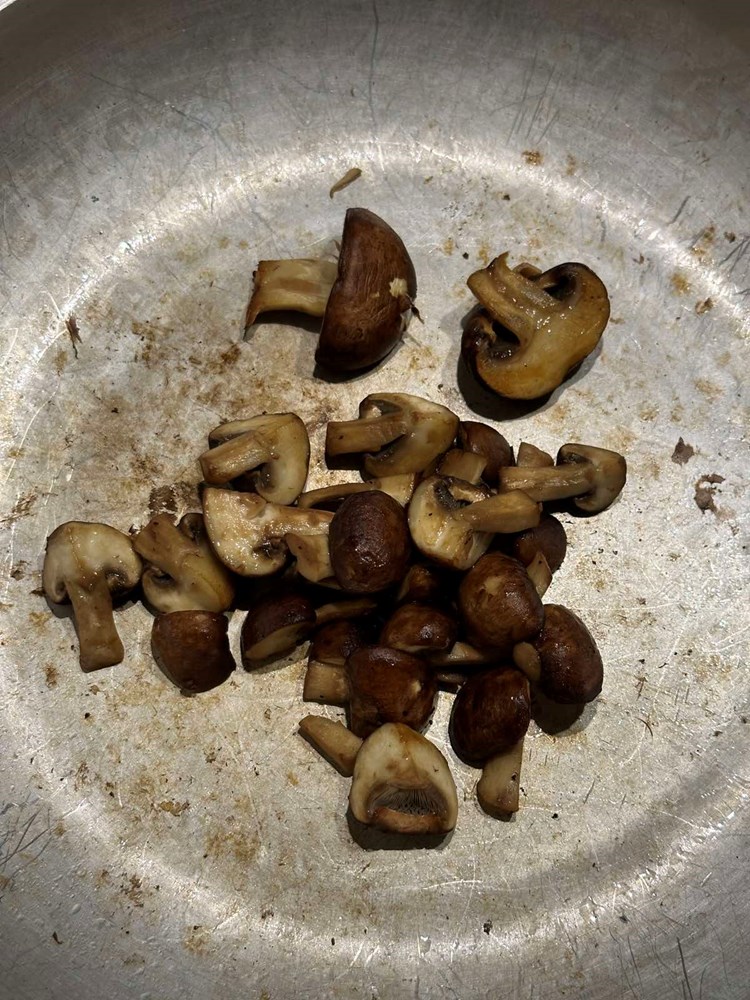 Na zagrijanu tavu u kojoj se nalazi mast od pancete stavite pržiti smeđe šampinjone koje ste prethodno narezali na četvrtine. Nakon cca. 5 minuta prženja nakon što su šampinjoni poprimili mjestimice smećkaste tonove maknite tavu s izvora topline.