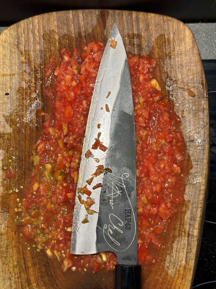 Oštrim kuhinjskim nožem usitnite pomidore na što sitnije komade (vidi fotografiju).