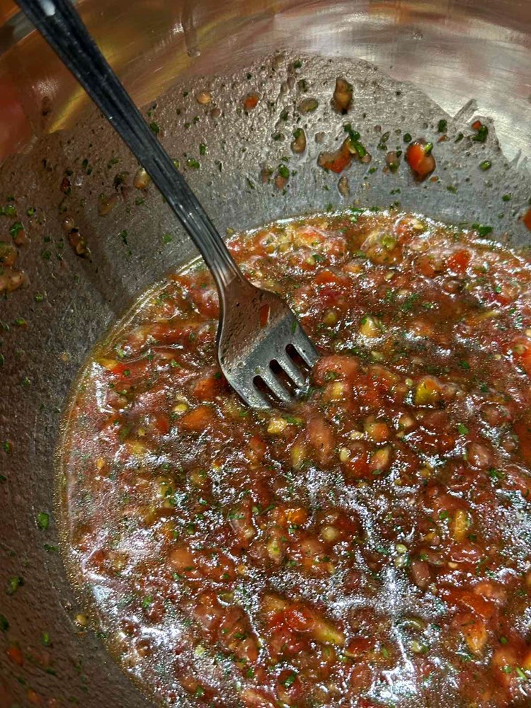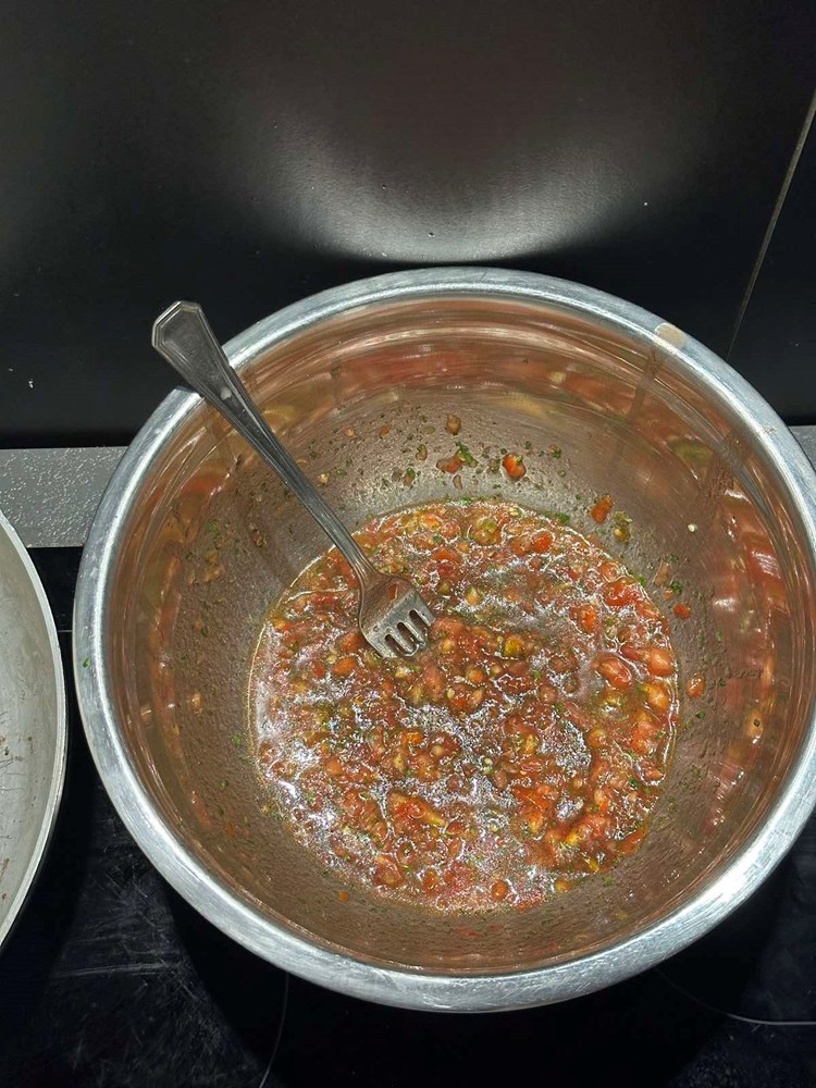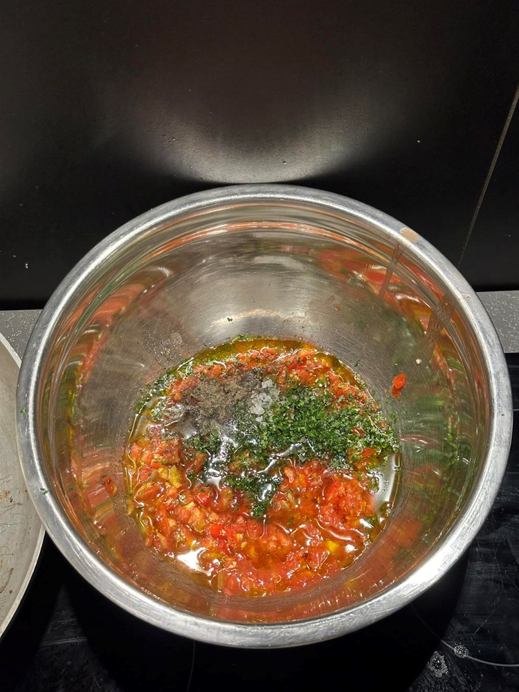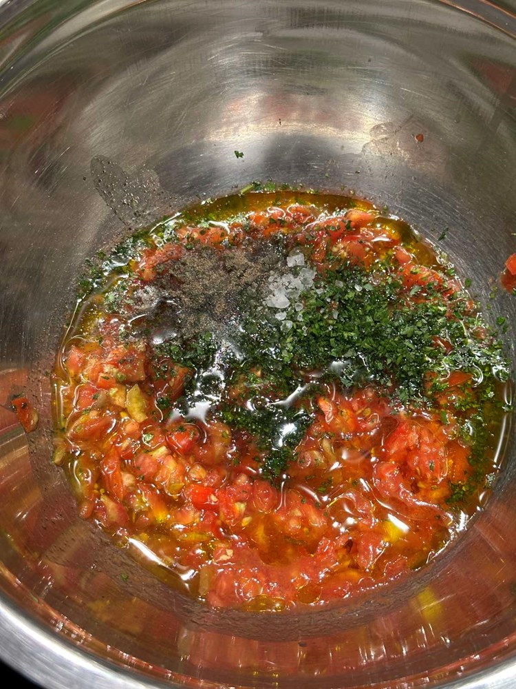 Usitnjene pomidore stavite u manju zdjelu pa unutra još ubacite sitno nasjeckani peršin, sitno nasjeckane listove svježe mente, jušnu žlicu maslinovog ulja, prstohvat cvijeta morske soli, prstohvat crnog, friško samljevenog papra i čajnu žličicu meda. Sve ovo unutar zdjele vilicom dobro izmiješajte par minuta i dobili ste svoju "crudo" šalšu.
