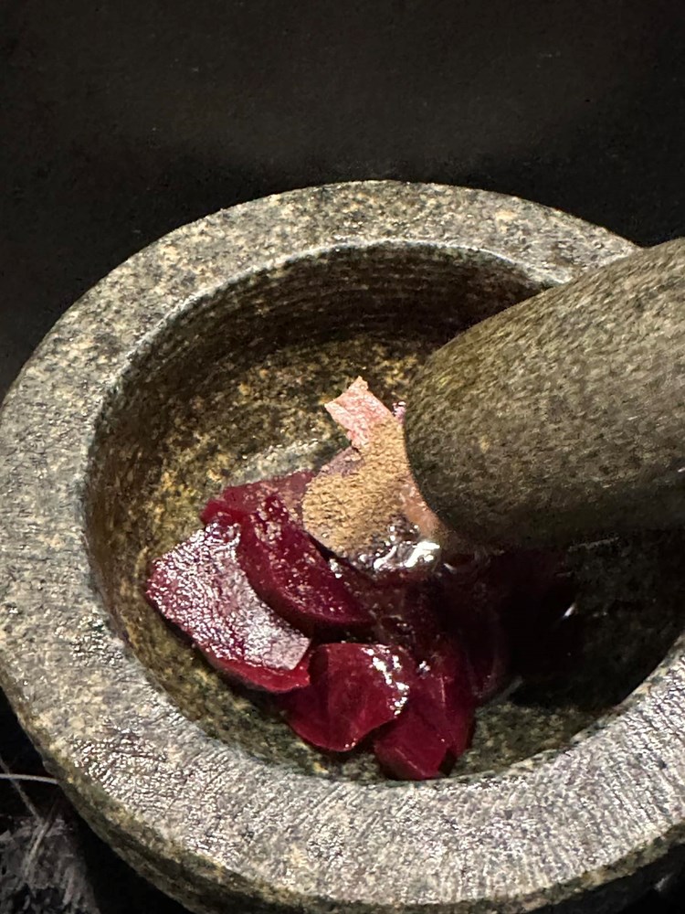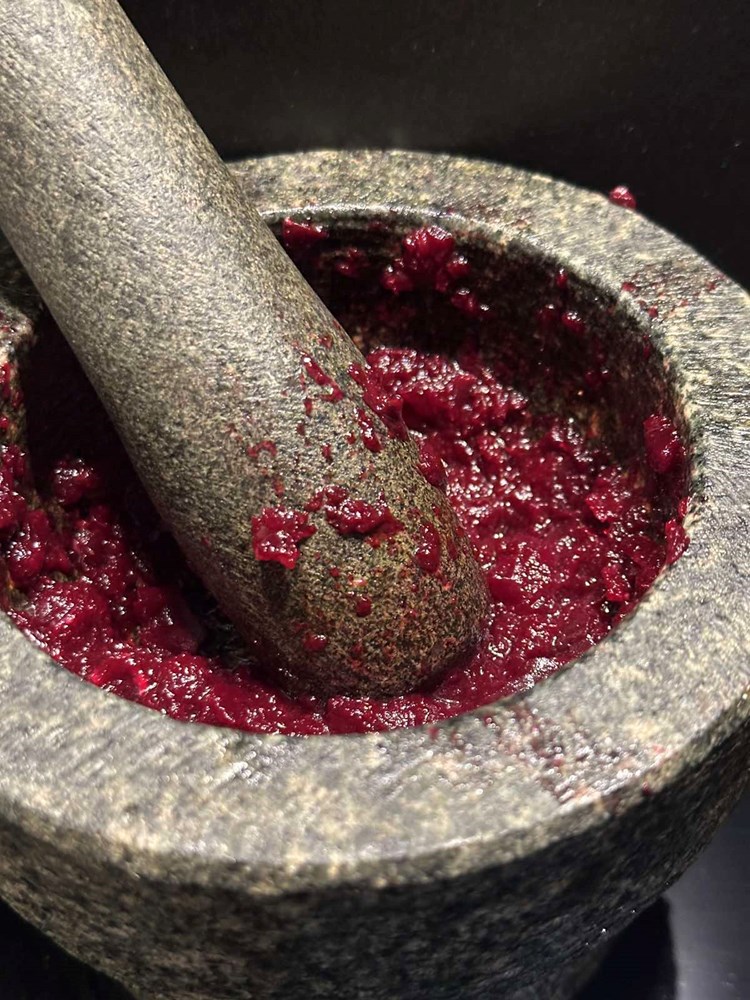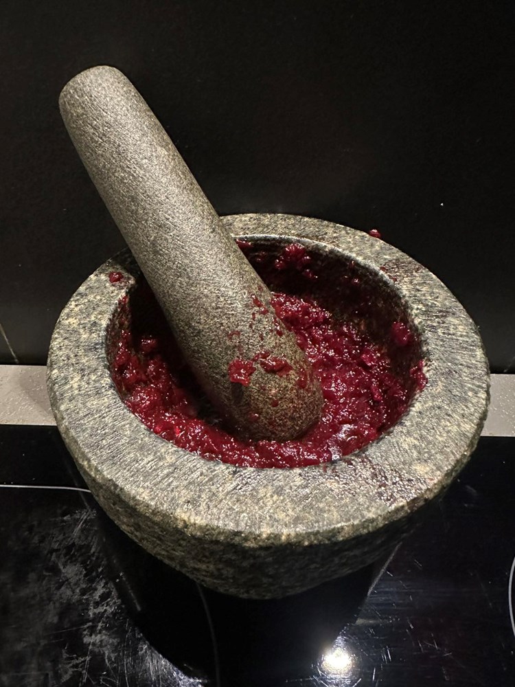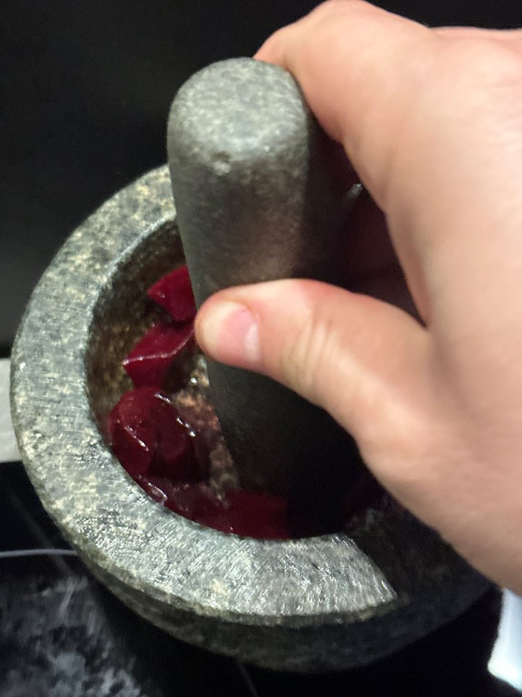 Sada u očišćeni mužar stavite pola kuhane cikle, jedan file slane srdele, 1/3 žličice crnog friško samljevenog papra, čajnu žličicu meda i 1/3 jušne žlice maslinovog ulja. Sve ovo unutar mužara dobro izgnječite kamenim štapom mužara dok ne dobijete gustu kompaktnu smjesu. Izvadite sadržaj iz mužara u zasebnu manju zdjelicu.