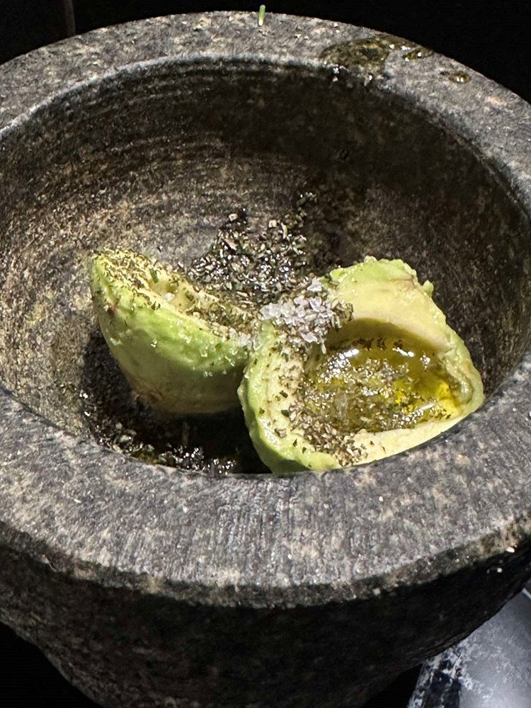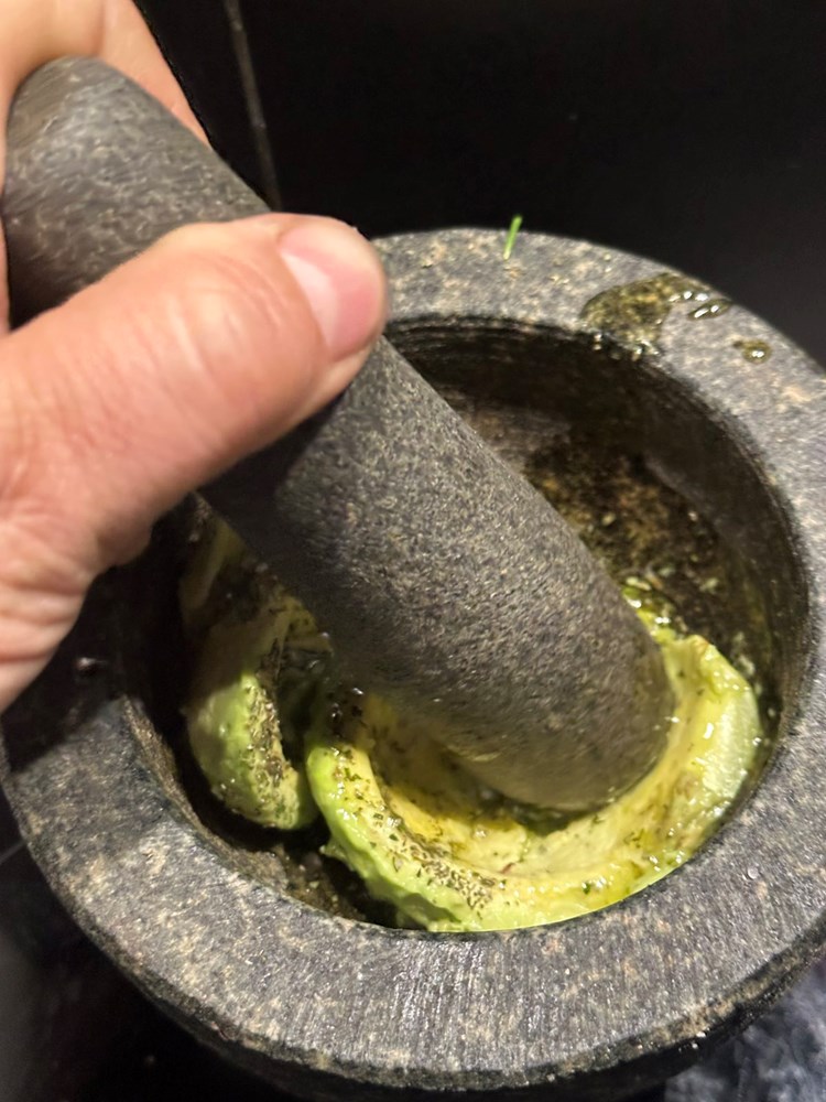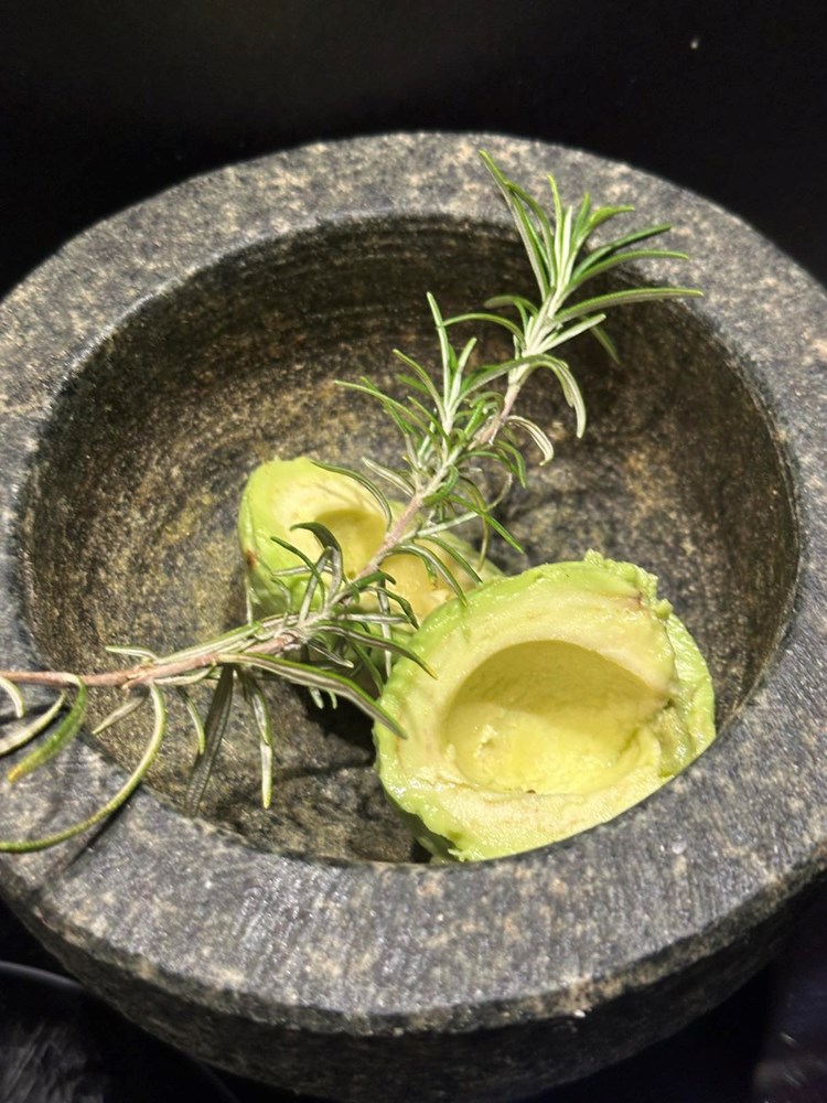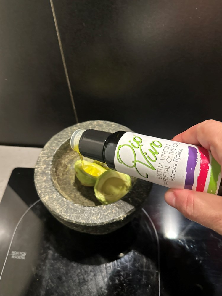 Izdubljeno meso avokada stavite u "mužar", unutra još dodajte sitno nasjeckane iglice svježeg ružmarina (vidi fotografiju), pola jušne žličice maslinovog ulja, 1/3 čajne žličice cvijeta morske soli... Pa sve zajedno štapom od mužara dobro izgnječite dok ne dobijete kompaktnu masu po svojoj strukturi nalik nekom namazu ili pašteti.