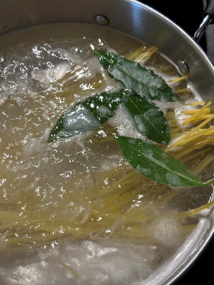 Na veliki ravan tanjur stavite spaghette koje ste prethodno skuhali u kipućoj slanoj vodi i listovima 4 lista lovora i na taj ih način dodatno aromatizirali.
