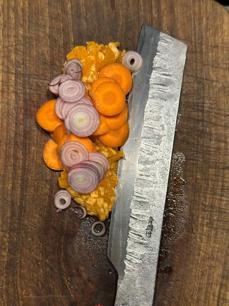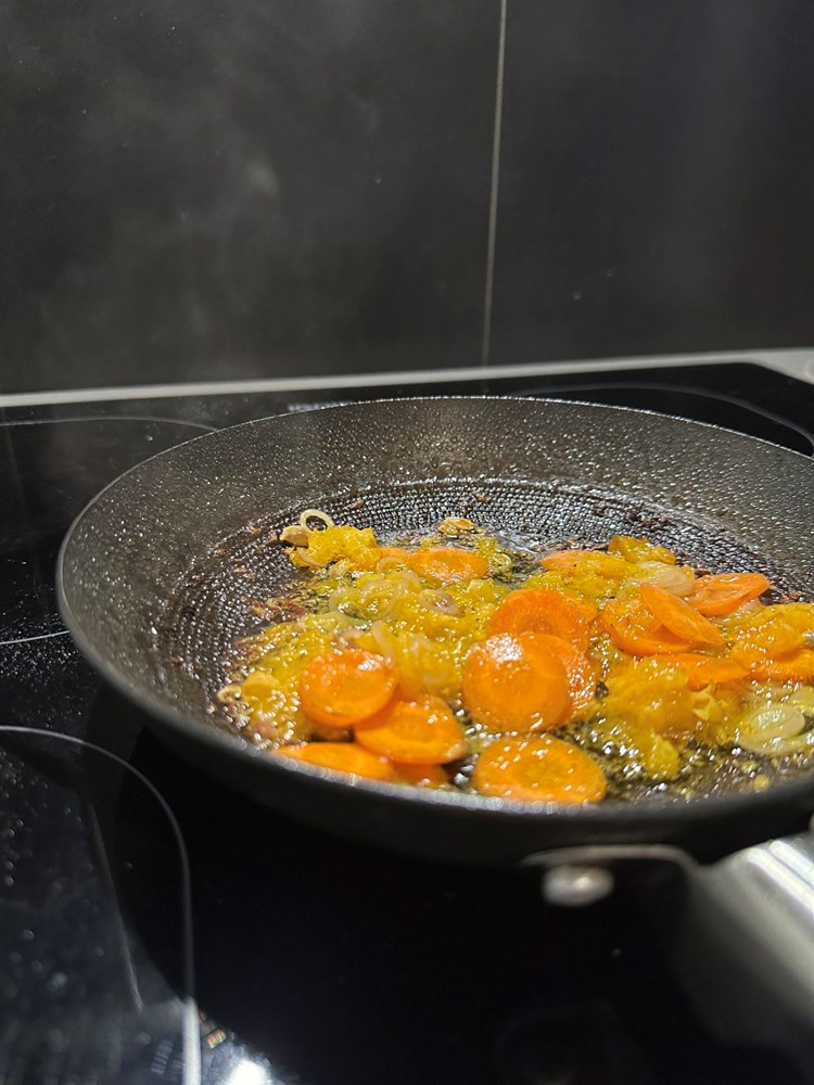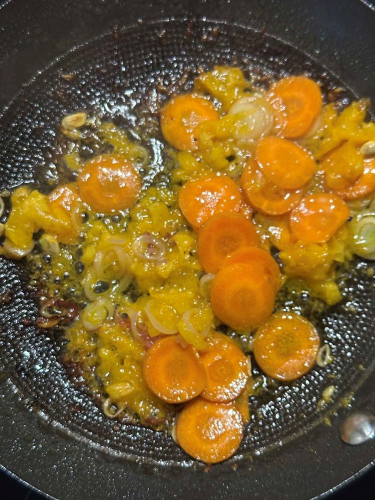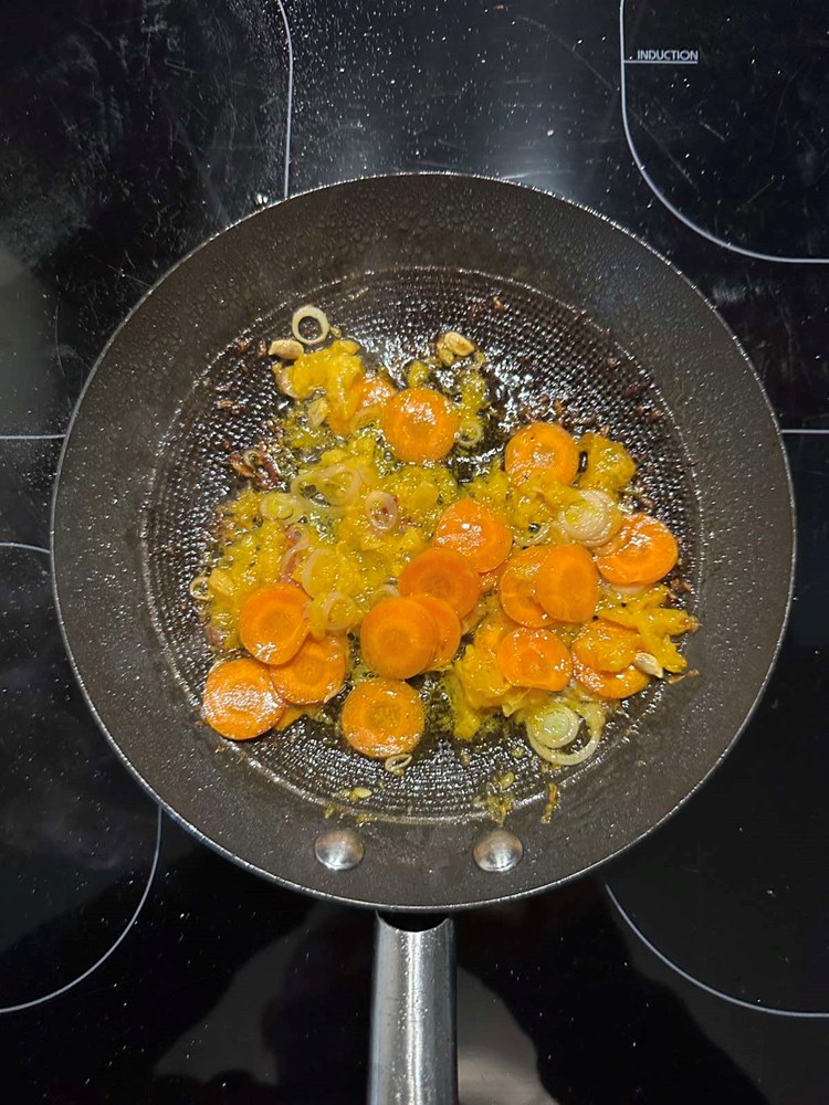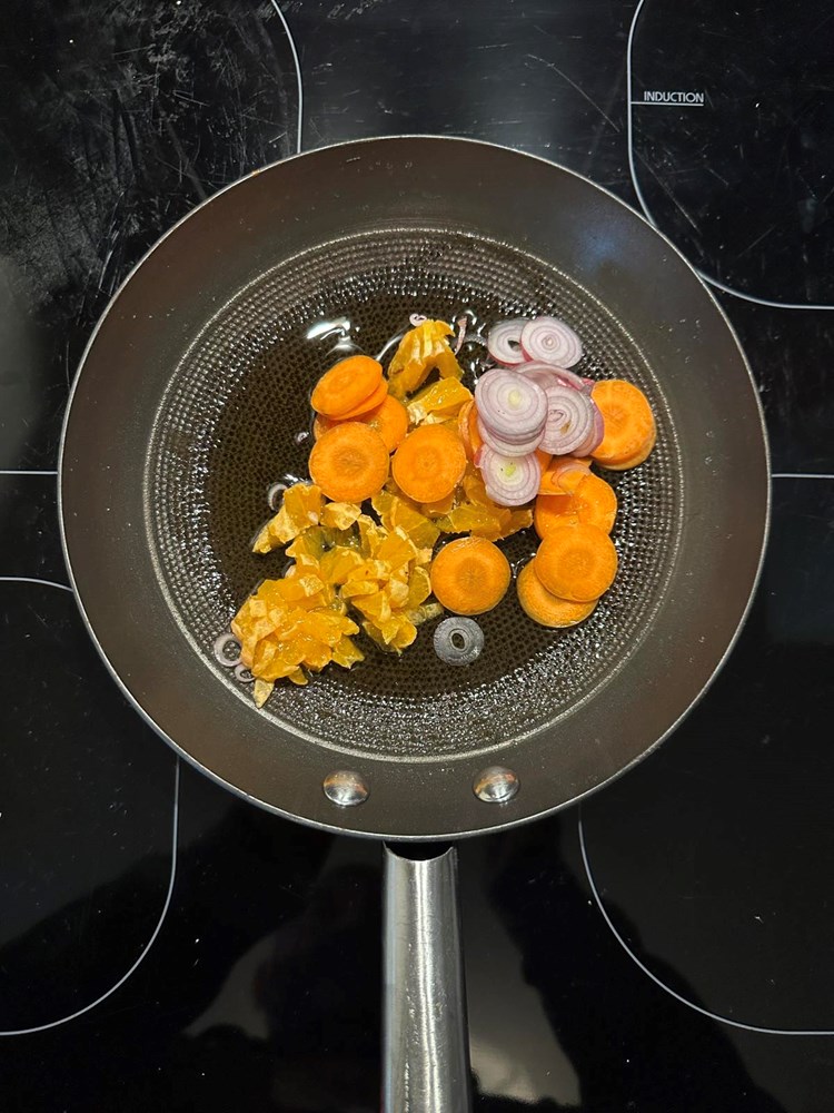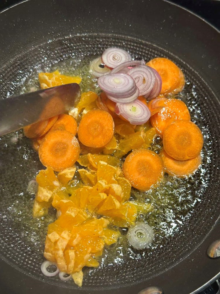 Manju mandarinu izrežite na što sitnije kockice, pola luka ljutike na tanke kolutiće, pola mrkve na kolutiće. Ovo sve ubacite u manju tavu na vrelo maslinovo ulje, na srednje jakoj vatri (bez soli papra i bilo kojih drugih začina - već ste dovoljno začinili ona dva namaza koja ste napravili u mužaru) i pržite uz konstantno miješanje tri do maksimalno četiri minute pa maknite tavu s izvora topline.