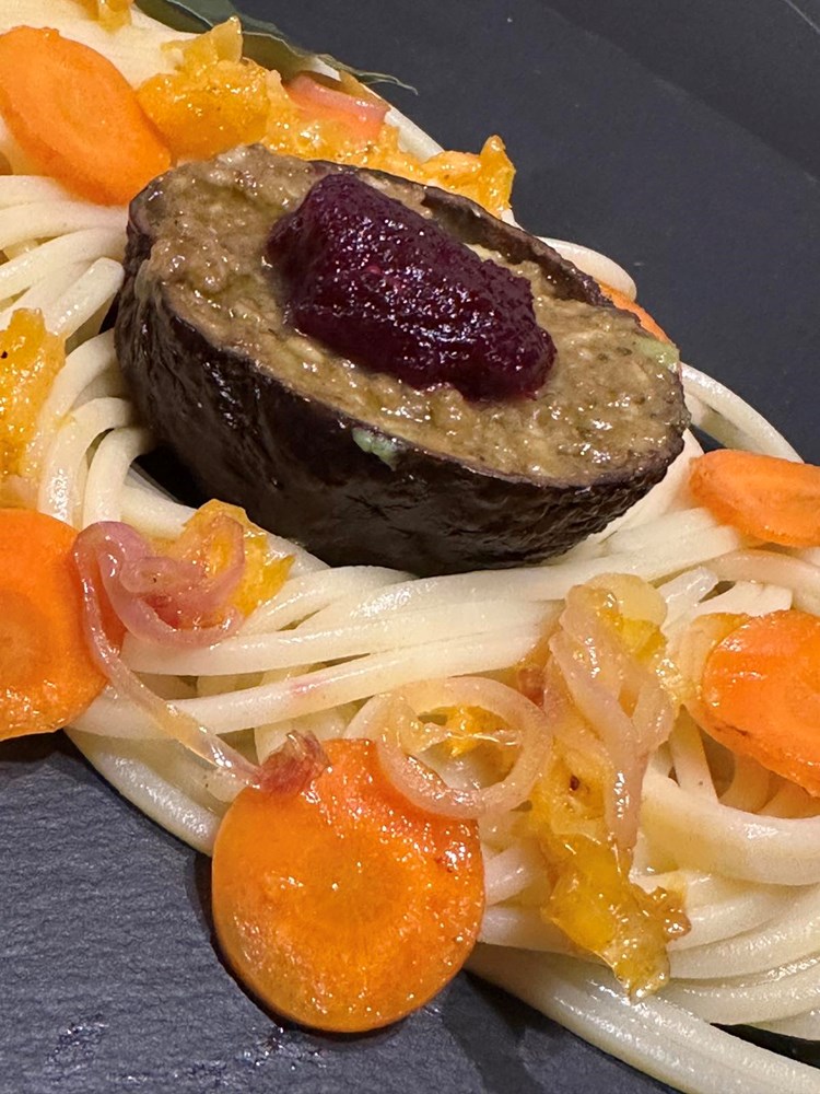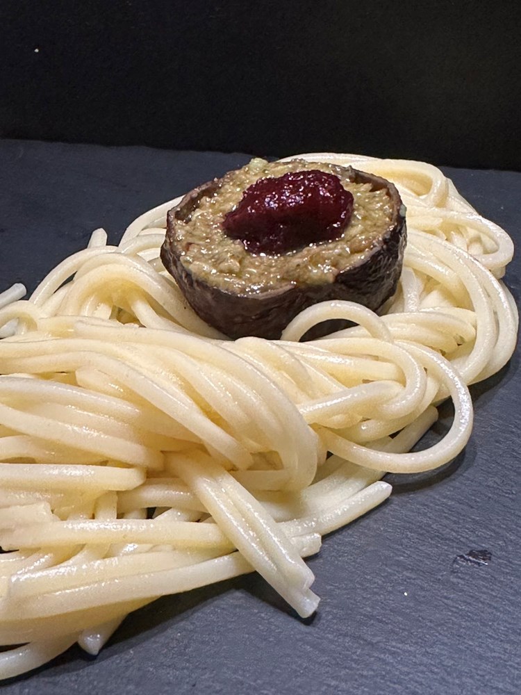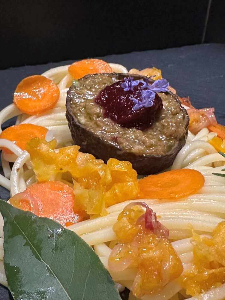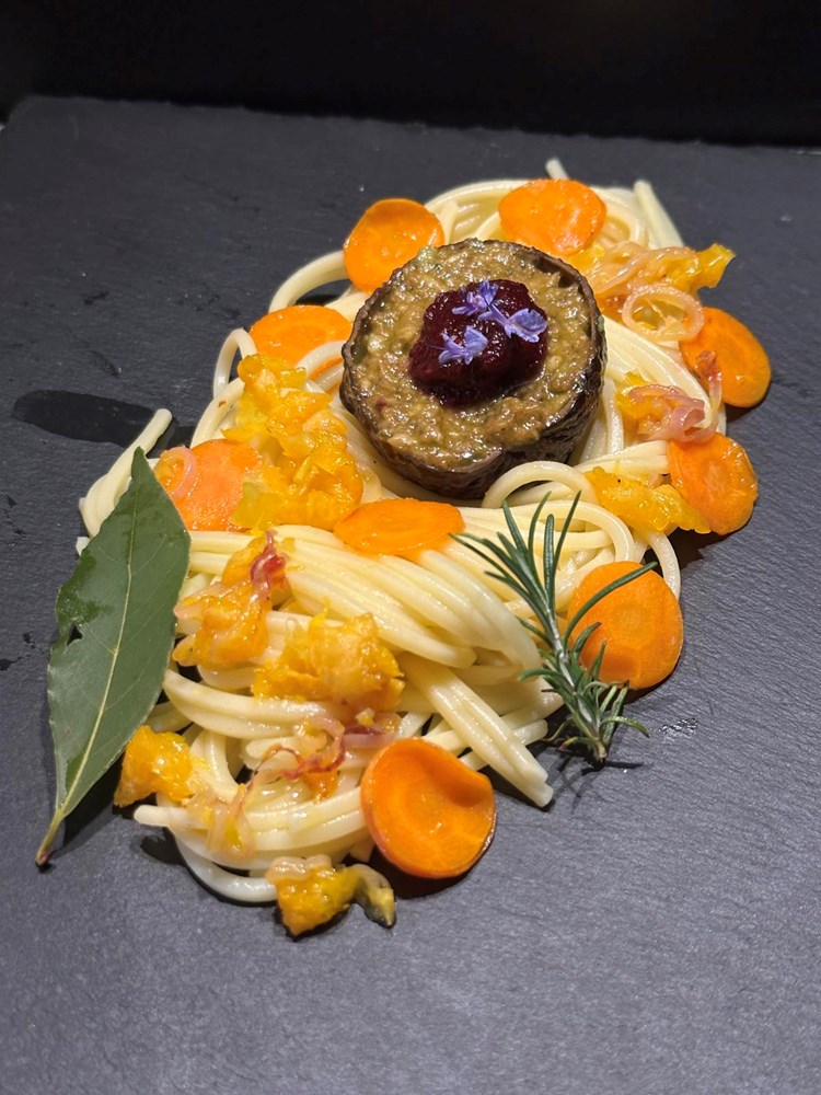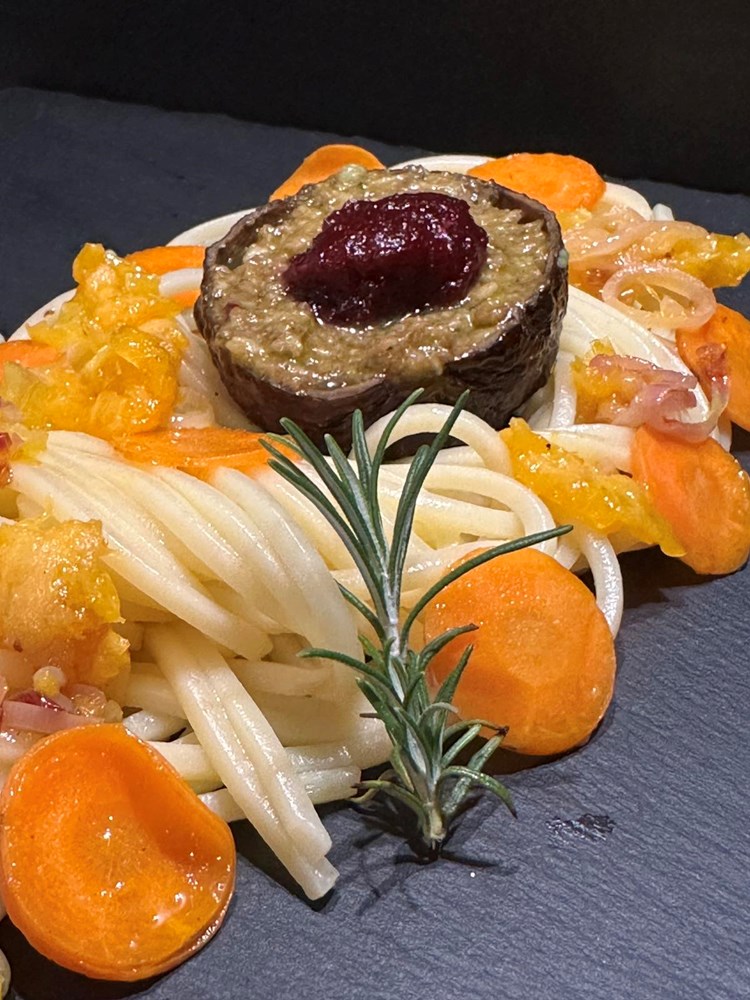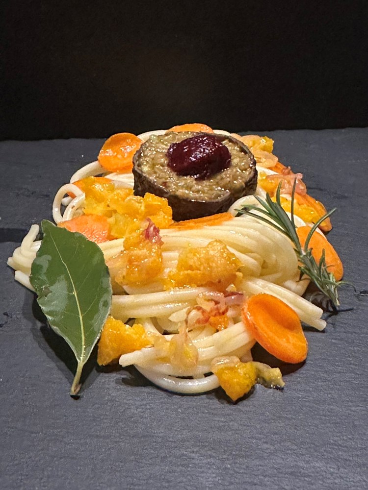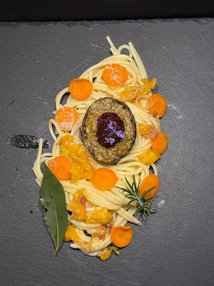 Svuda naokolo po spaghettima raspodijelite vaš umak od mrkve i mandarine iz tave. Ja sam za dekoraciju stavio na umak od cikle i slane srdele nekoliko cvijetova ružmarina … vi možete staviti i neke druge jestive biljke koje vam se nadu trenutno pri ruci… Uživajte u fuziji i ispreplitanu ovih mediteranskih okusa koji se iznad vašeg cijenjenog nepca spajaju u jednu aromatsku cjelinu, zadržavajući pritom izdvojene okuse koji se savršeno sljubljuju … ova je harmonija okusa baš poput nekog gurmanskog Rock’n’roll -a… Uživajte! Vaš Outlaw …