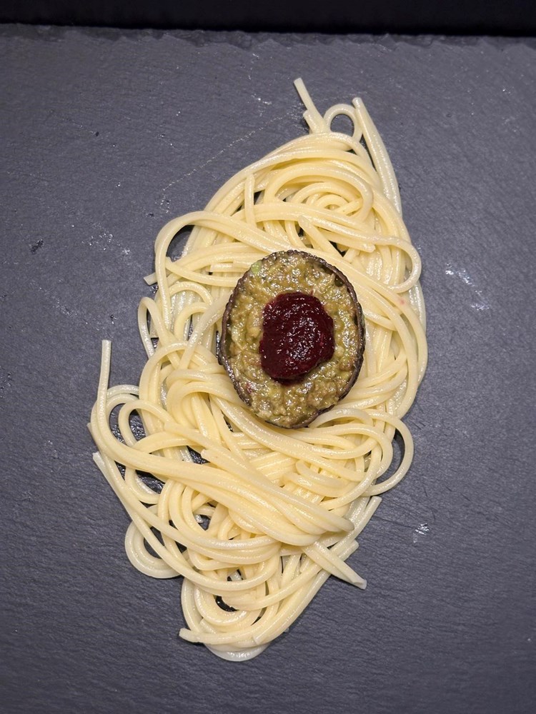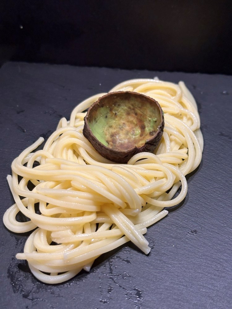 U praznu ljusku avokada koja se nalazi na spaghettima stavite manjom žlicom namaz od avokada kojeg ste napravili.