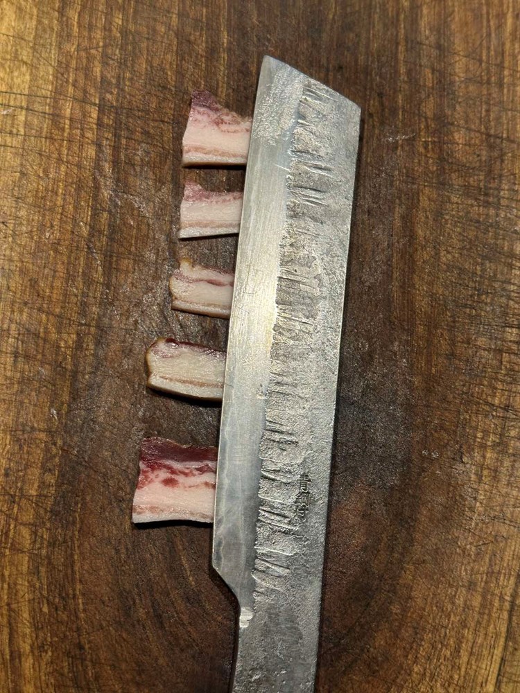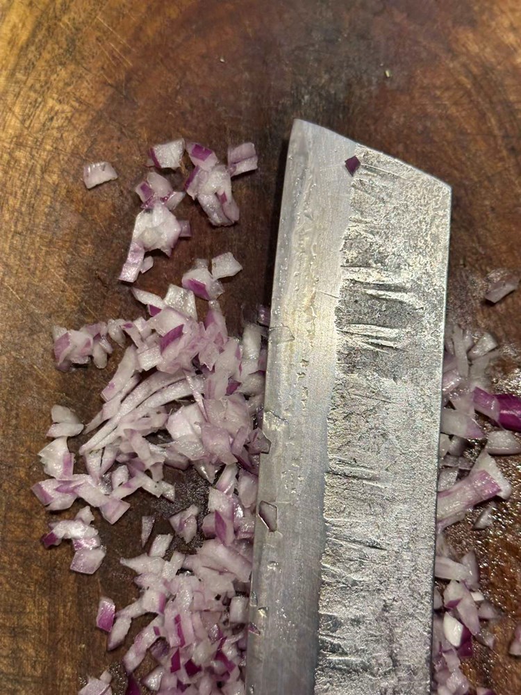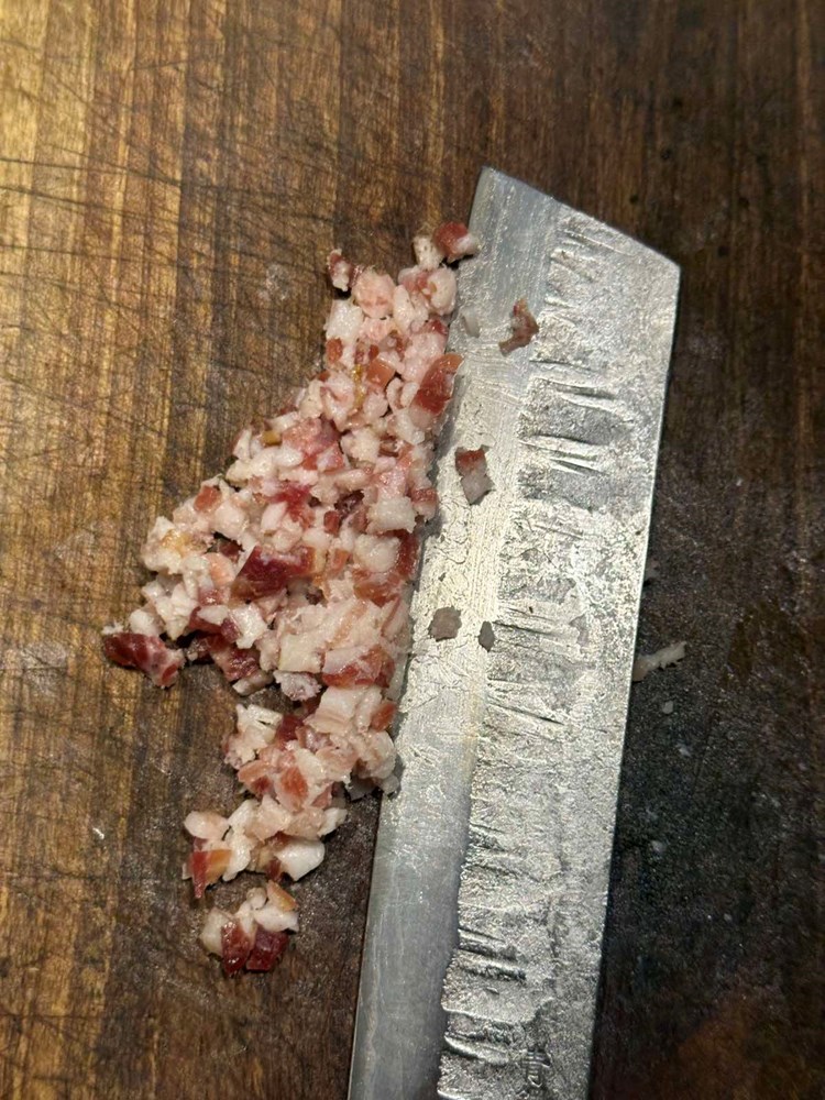 Oštrim kuhinjskim nožem usitnite dimljenu pancetu pa ju stavite u zdjelicu s usitnjenim mesom.