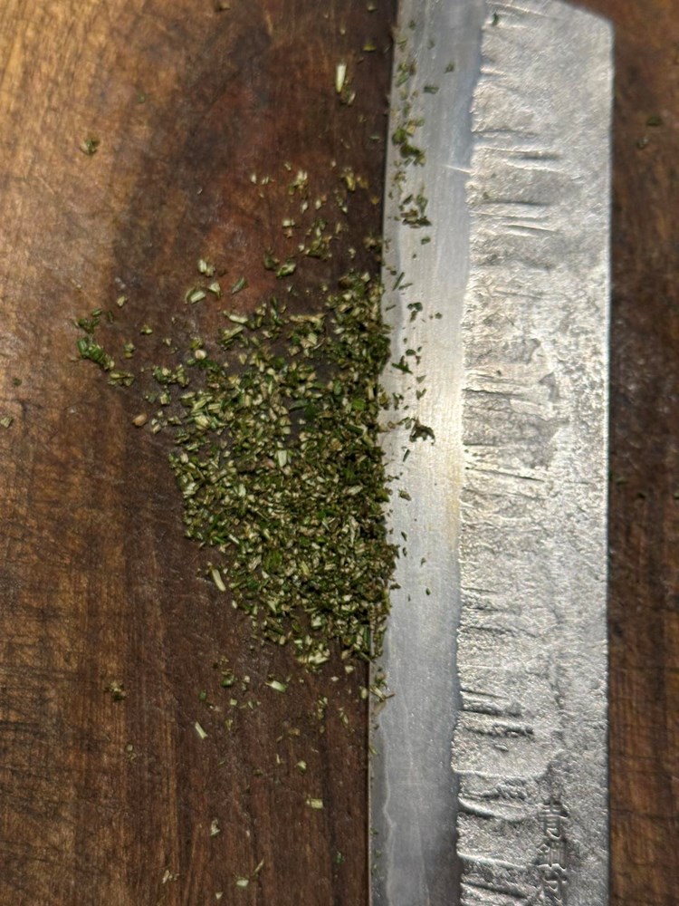 Oštrim kuhinjskim nožem usitnite iglice sviježeg ružmarina ( vidi fotografiju) . Usitnjeni ružmarin također stavite u zdjelicu sa mesom i dimljenom pancetom.