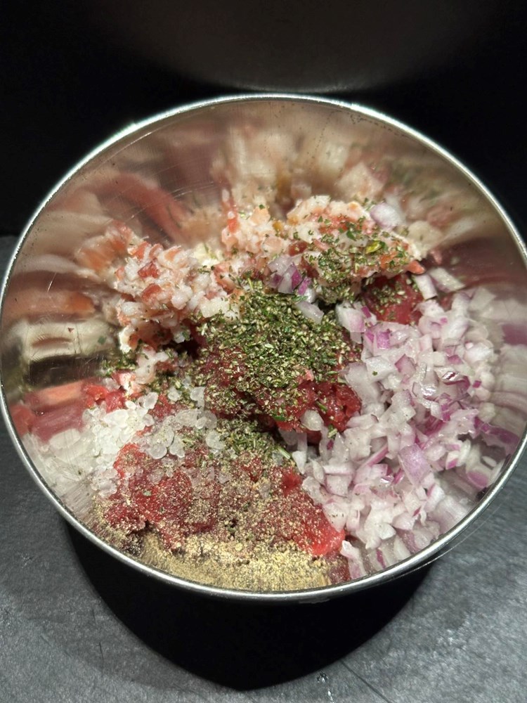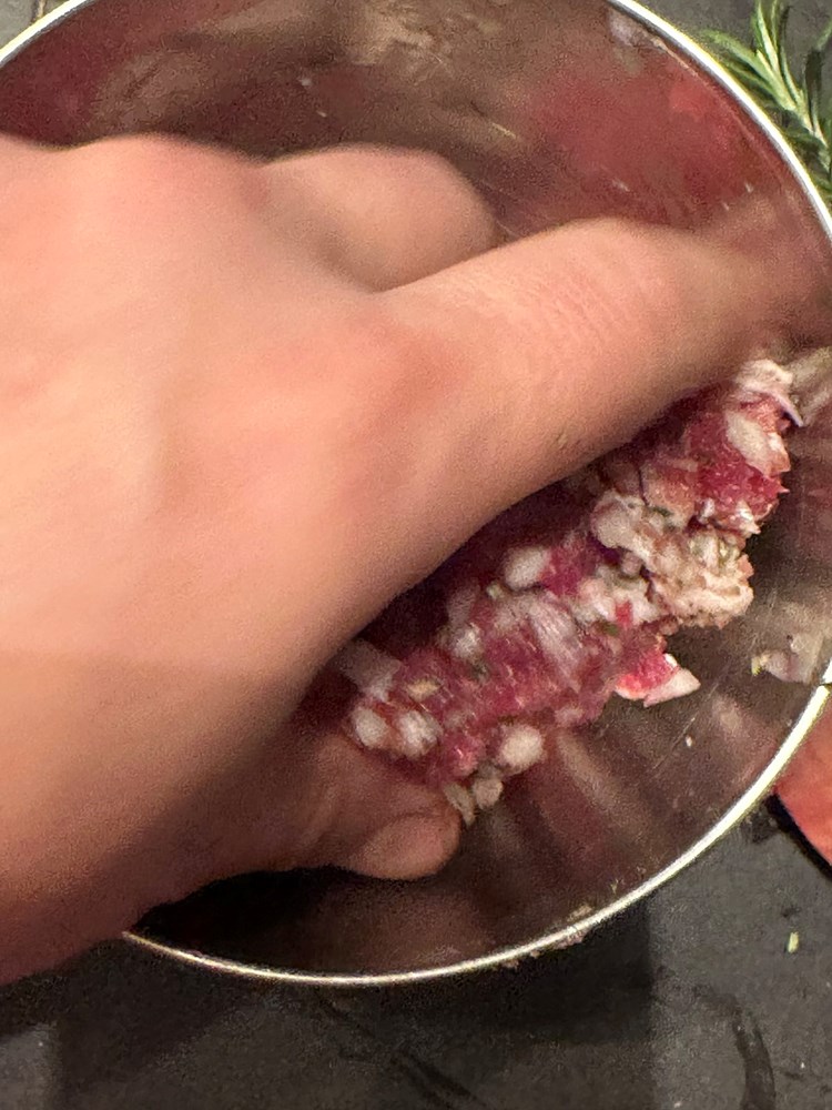 Zatim usitnite 1/4 glavice crvenog luka i njega stavite u zdjelicu sa usitnjenom junetinom, dimljenom pancetom i ružmarinom. Uz sve ovo u zdjelici dodajte 1/3 čajne žličice cvijeta morske soli i 1/3 čajne žličice crnog , friško samljevenog papra pa dobro rukom izmiješajte da smjesa u zdjelici postane kompaktna.