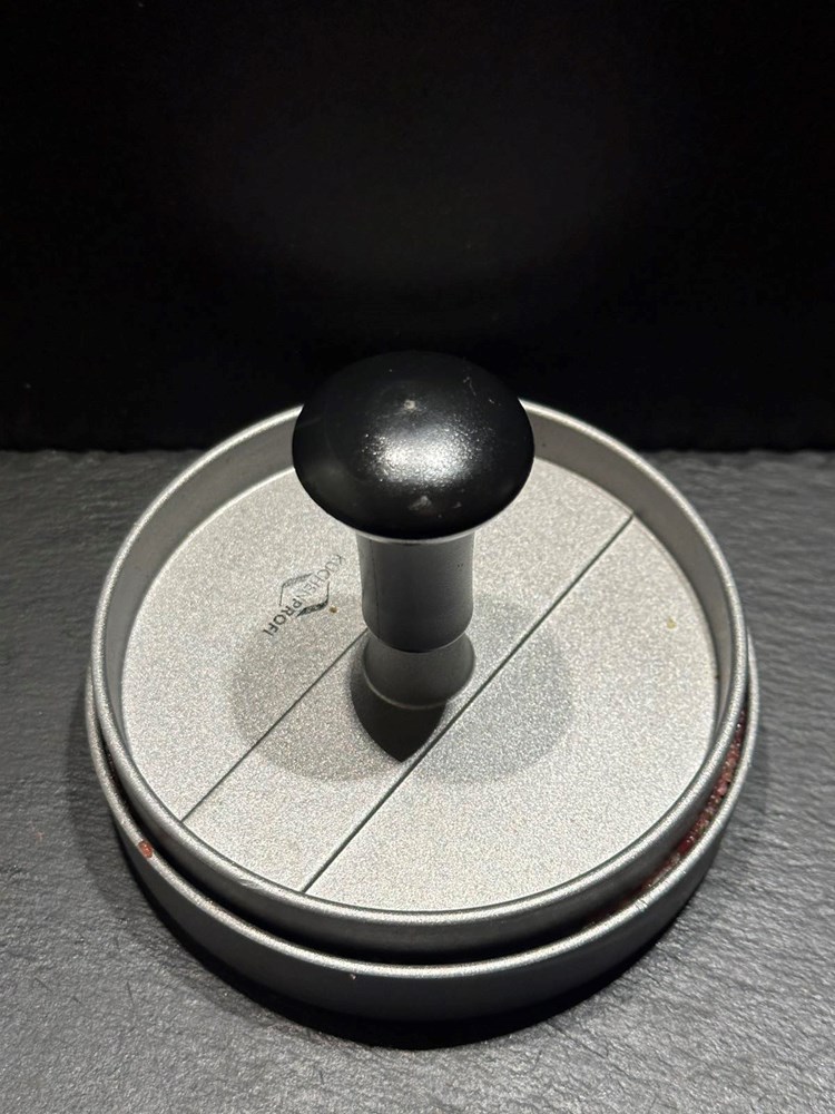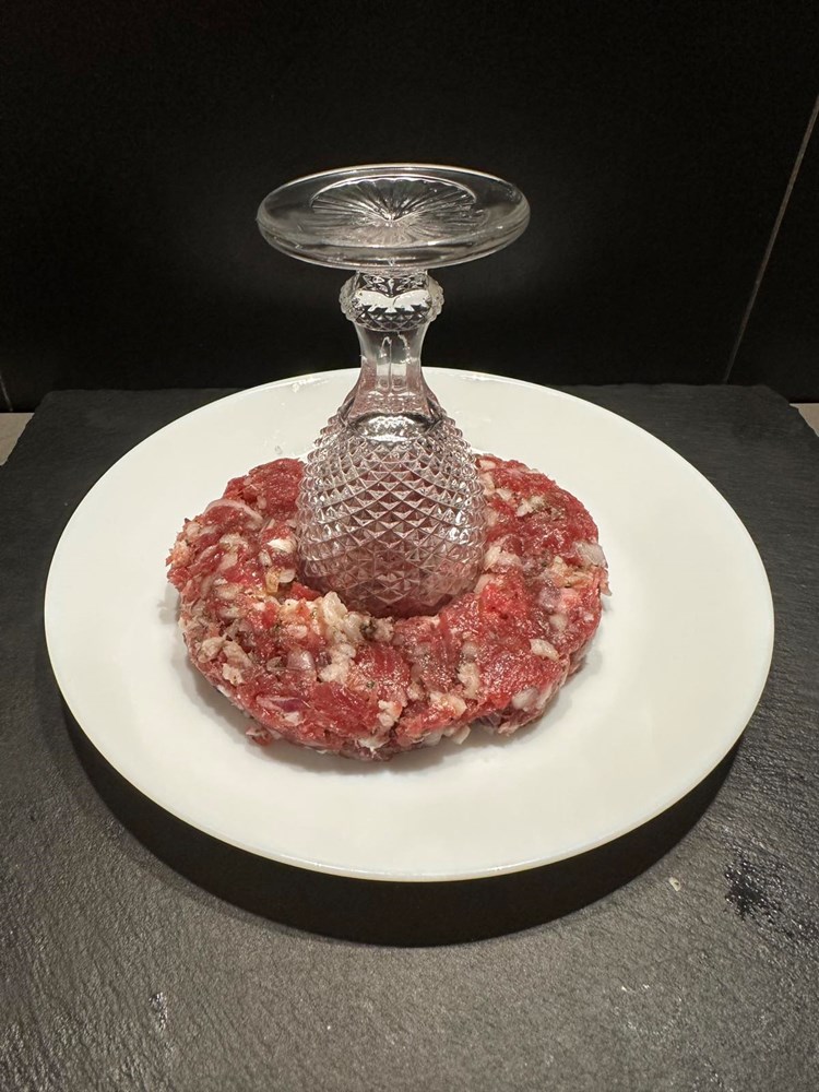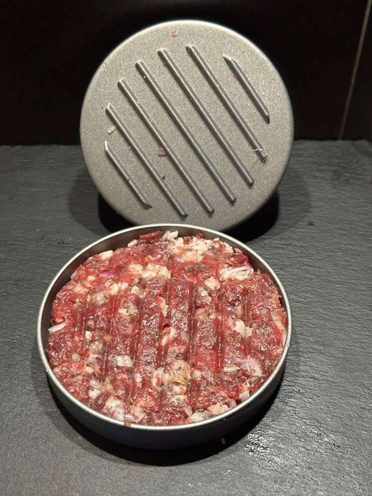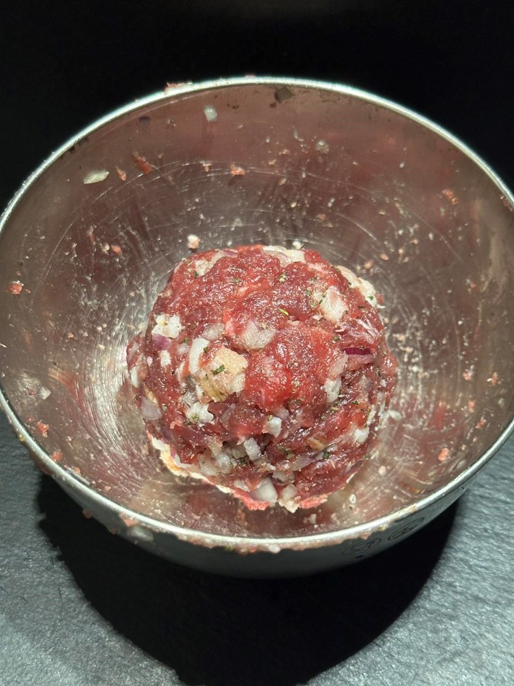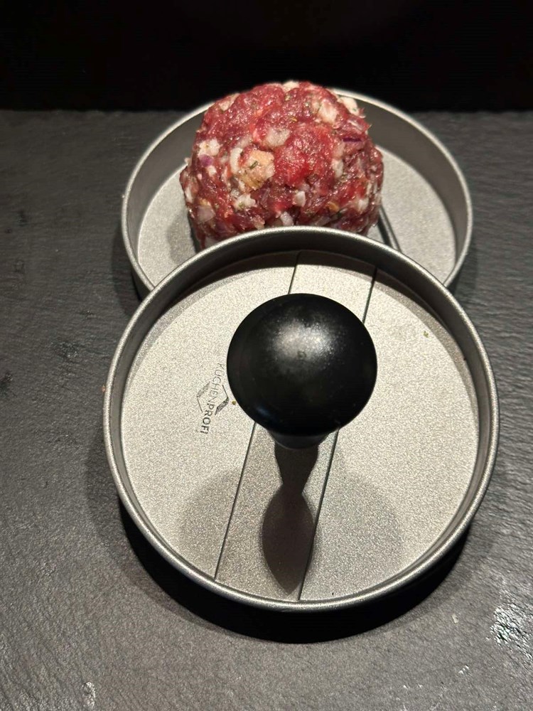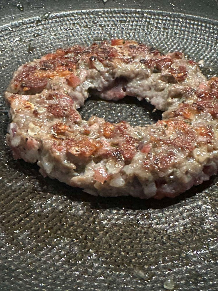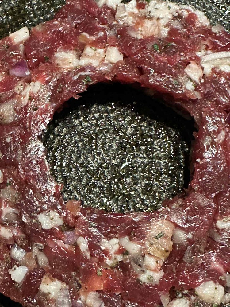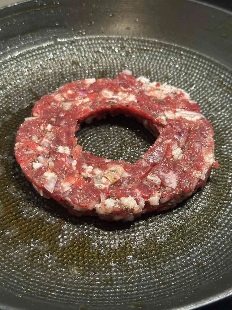 Dobivenu pljeskavicu stavite na manji tanjur pa manjom čašicom (vidi fotografiju) izdubite rupu u sredini. Onaj ostatak mesa iz sredine maknite- ja sam ga onako sirovog i začinjenog dimljenom pancetom, paprom soli i lukom pojeo , jer me podsjetio ma “biftek tartar” a vi s njime radite što hoćete…