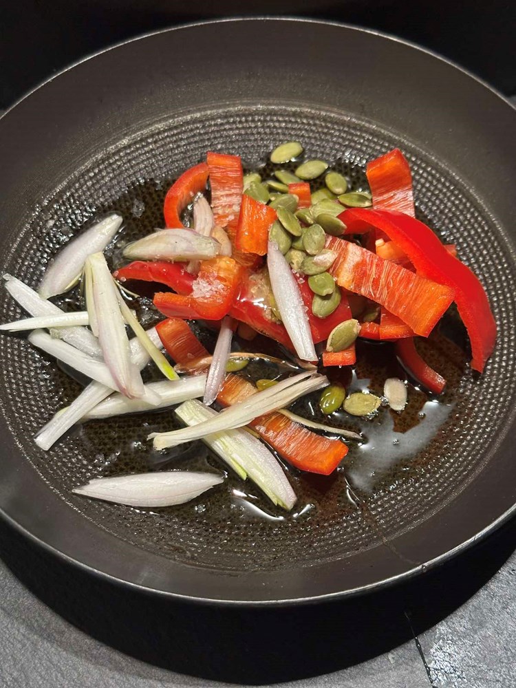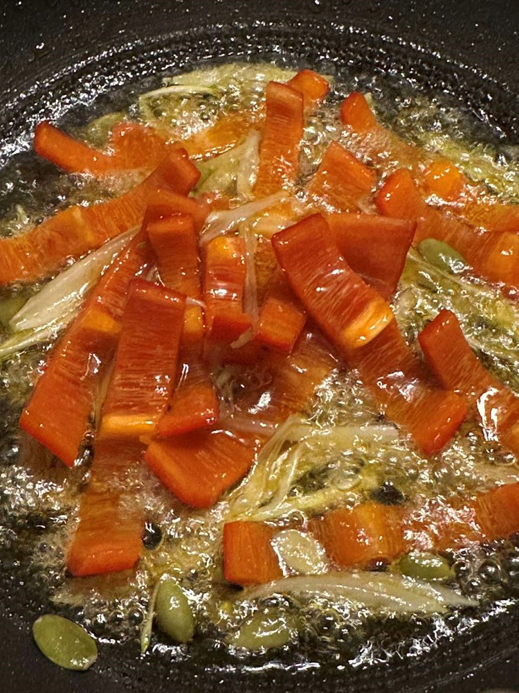 U drugu manju tavu na vrelom maslinovom ulju stavite pržiti sviježu slatku crvenu papriku izrezanu na trakice, luk ljutiku izrezan na trakice, bućine sjemenke, čajnu žličicu meda , 1/3 čajne žličice cvijeta morske soli i 1/3 čajne žličice zelenog friško samljevenog papra.