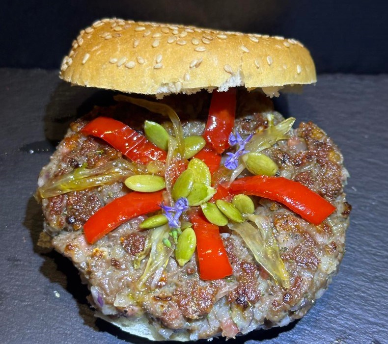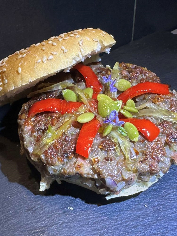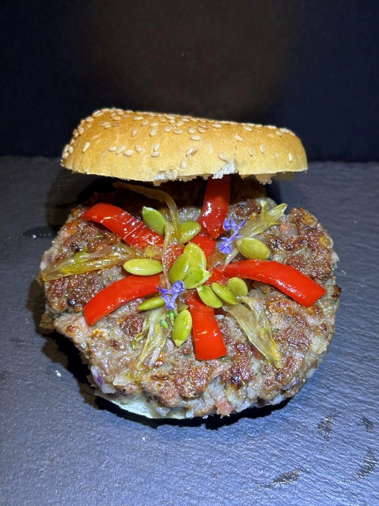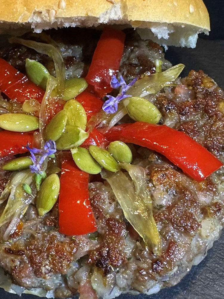 U ovu rupu u sredini stavite onu papriku i bućine sjemenke koju ste karamelizirani na medu , cvijetu morske soli i zelenom papru. Poklopite zatim vaš burger s gornjim polovicom peciva i zagrizete u burger…. Uživajte u harmoniji okusa koji plešu na Vašem nepcu i uvode vas u ugodne kutke vašeg skrivenog podsvijesnog uma - mjesta koja su stvorena samo za vas… uživajte u miru trenutka…
