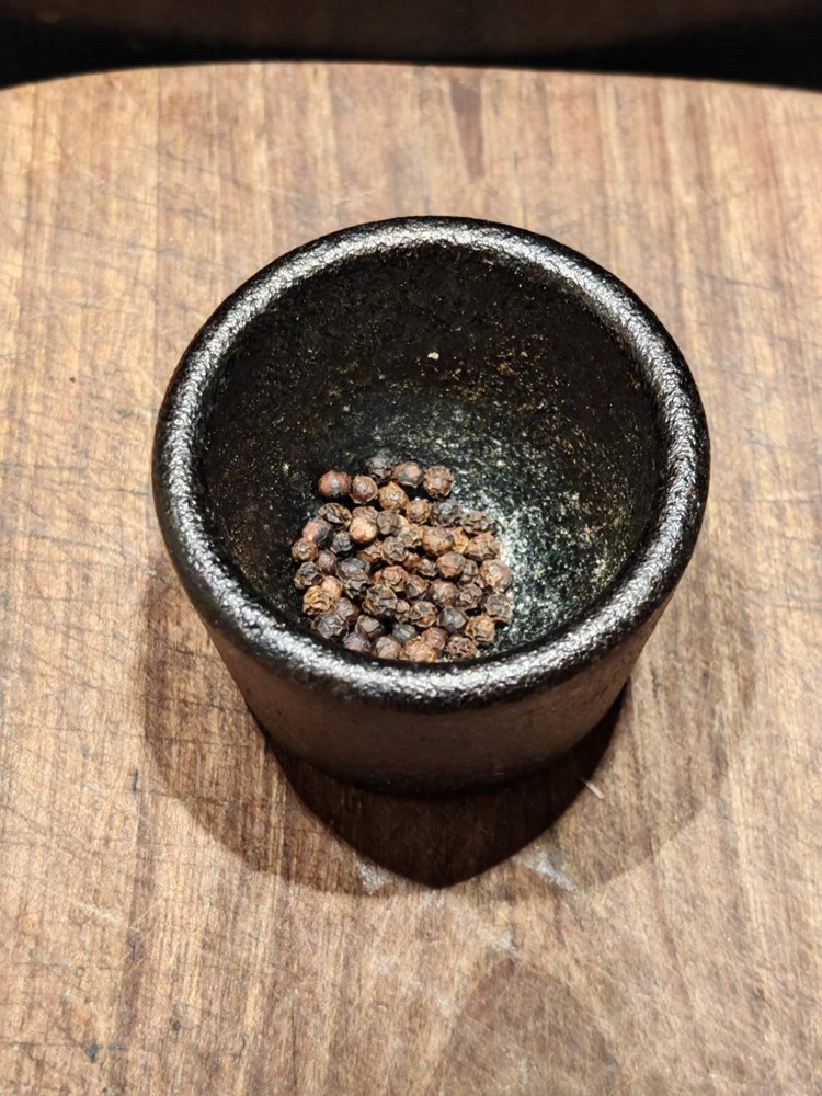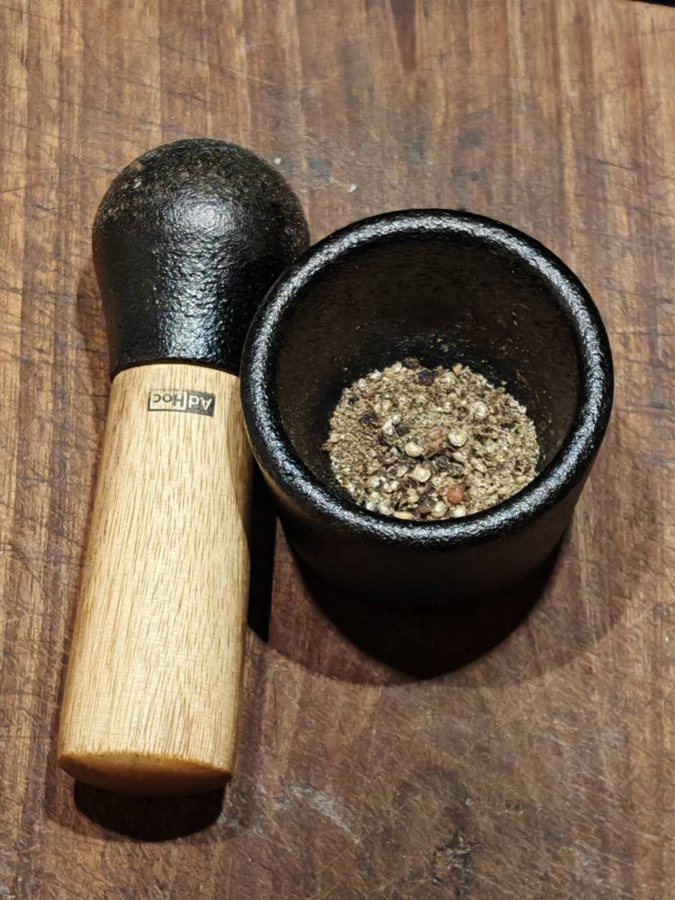 Skinite iglice sa grančice svježeg ružmarina, pa ih oštrim kuhinjskim nožem usitnite u prah. U mužaru zdrobite krupni crni papar na komadiće srednje veličine.