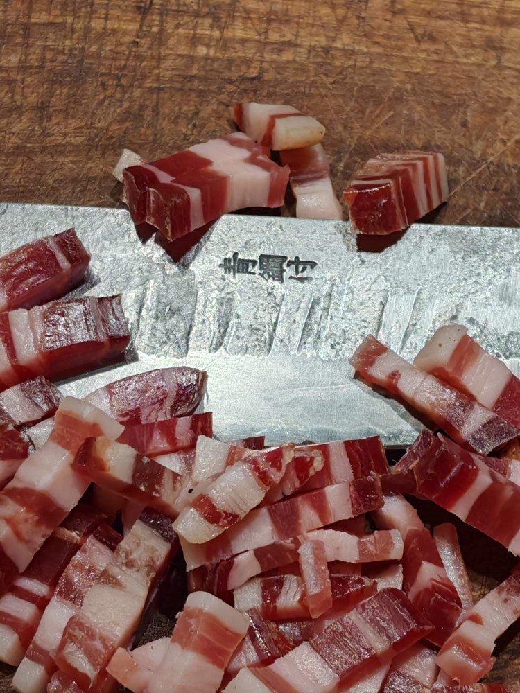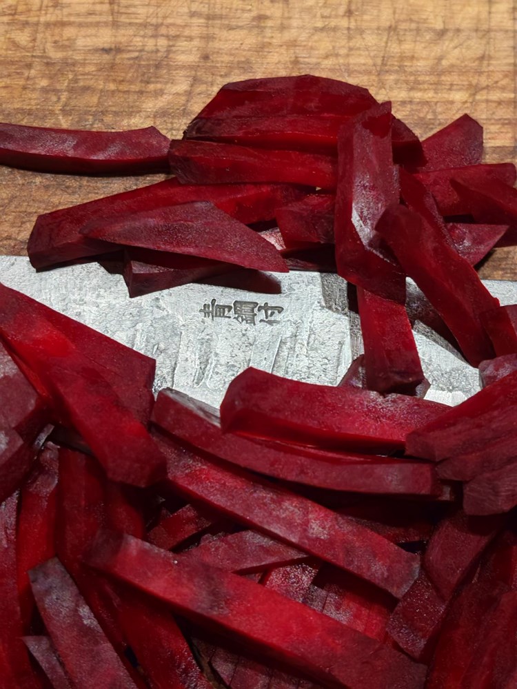 Izrežite na sitne trakice dimljenu pancetu. Izrežite na tanke trakice pola glavice luka. Izrežite na tanke listiće dva česna češnjaka. Ogulite koru svježoj cikli, pa ju narežite na tanke rezance.