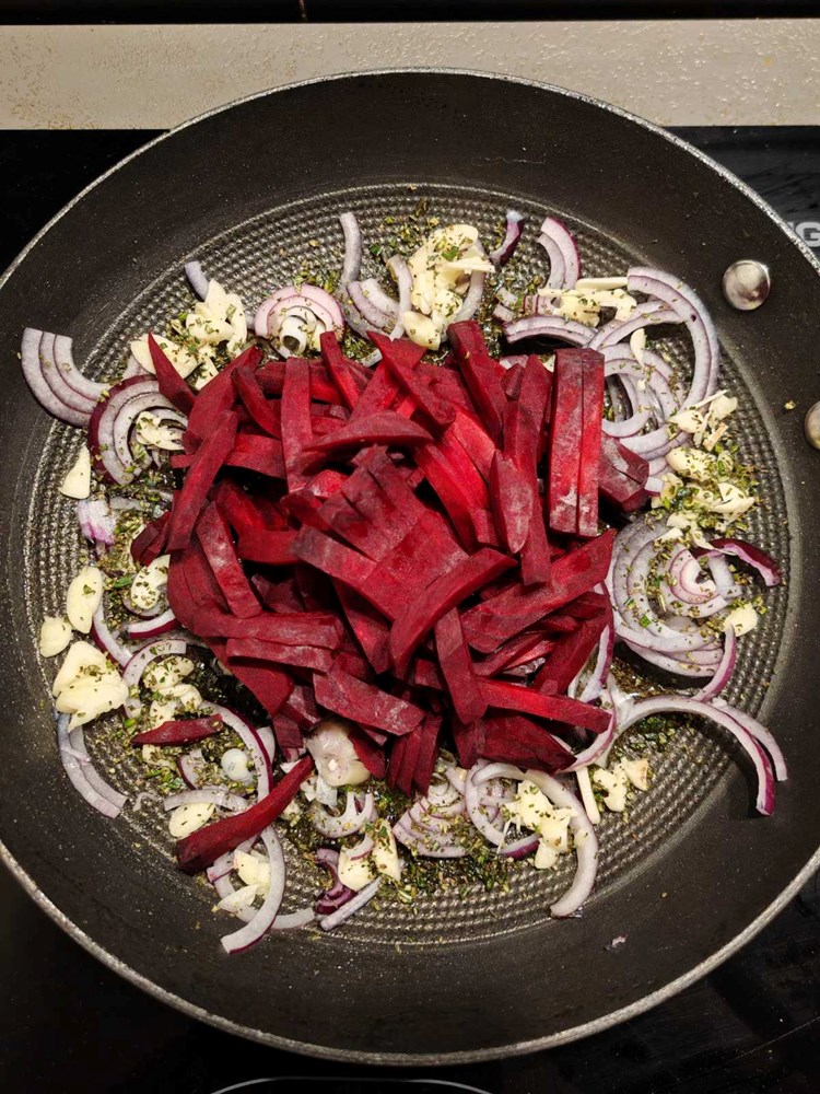 U drugoj manjoj tavi, na vrelom maslinovom ulju, na srednje jakoj vatri, uz konstantno miješanje, pržite svježu ciklu izrezanu na trakice, pola glavice luka izrezanog na trakice, dva česna češnjaka izrezanog na trakice, iglice grančice svježeg usitnjenog ružmarina i 1/3 čajne žličice cvijeta morske soli. Ovo uz konstantno miješanje pržite cca nekih 7 do 8 minuta pa maknite tavu s izvora topline.