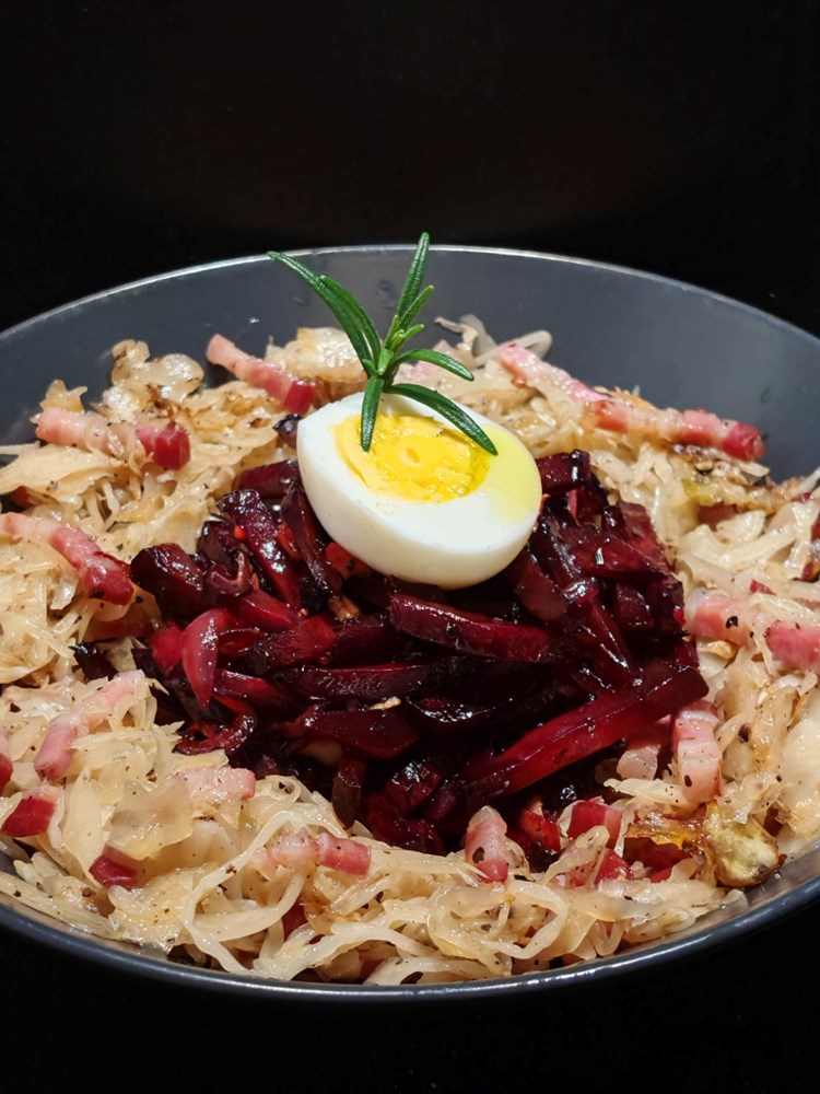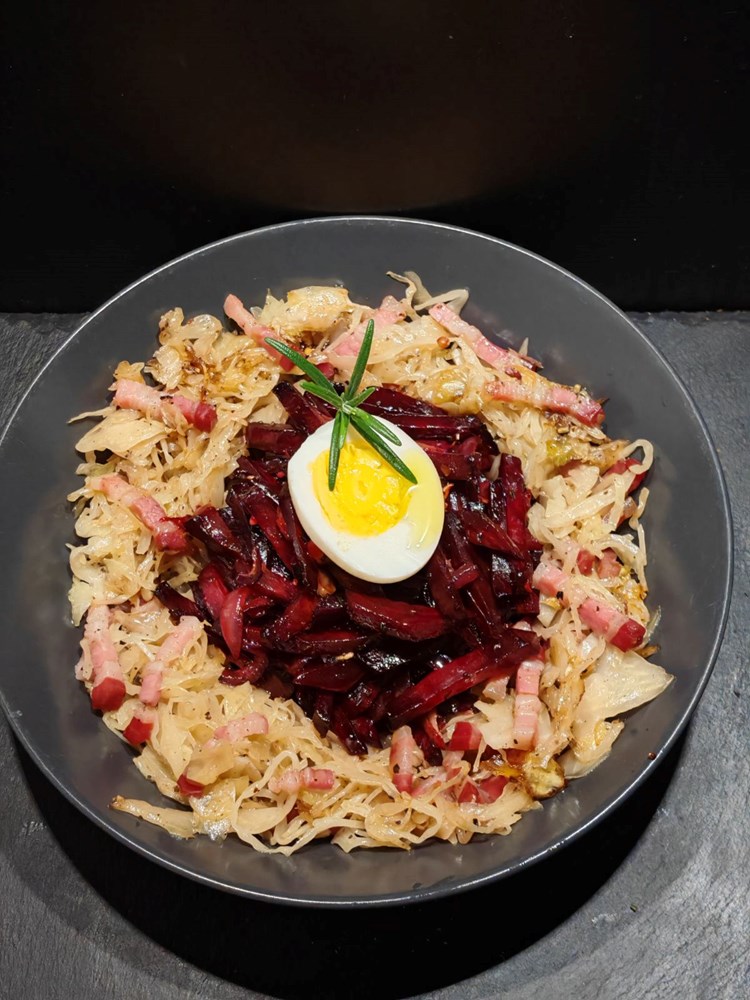 Dobar vam tek dragi čitatelji i uživajte u tri izdvojena okusa koja se sljubljuje i isprepliću. Tu je blaga slankastost i hrskavost kupusa i dimljene pancete ukroćena laganom i nenametljivom slatkoćom meda. Odmah zatim na red dolazi hrskava, ali ipak mekana cikla koja se savršeno sljubljuje s eterikom papra i ružmarina, a tu je i kuhano jaje koje svojim blagim okusom zaokružuje cijelu priču blagoslovljenu izvanrednim okusom maslinovog ulja.