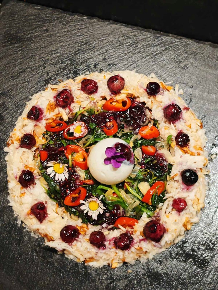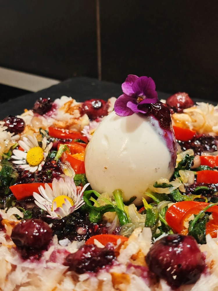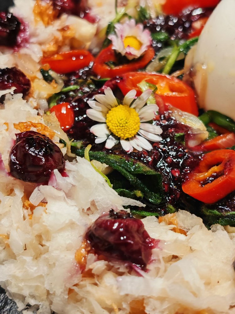 Karamelizirane borovnice u u zelenom papru i medu poslažite po vijencu od celera. Dobiveni gusti umak koji je iscurio iz borovnice, zelenog papra i meda malom čajnom žličicom prelije varivo od tratinčice i kupine. Jedan manji dio tog umaka stavite na vrh tvrdo kuhanog jaja. On će poslužiti kao ljepilo na koje ćete staviti svježi cvijet šumske ljubičice.