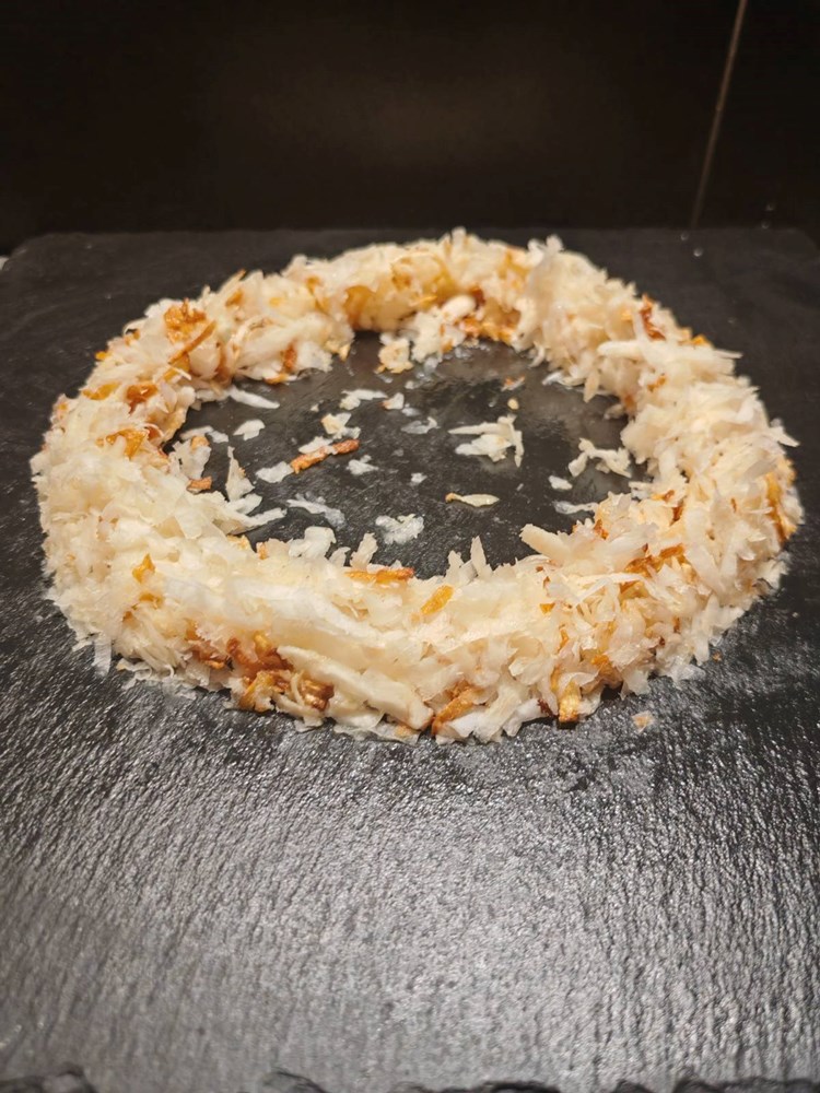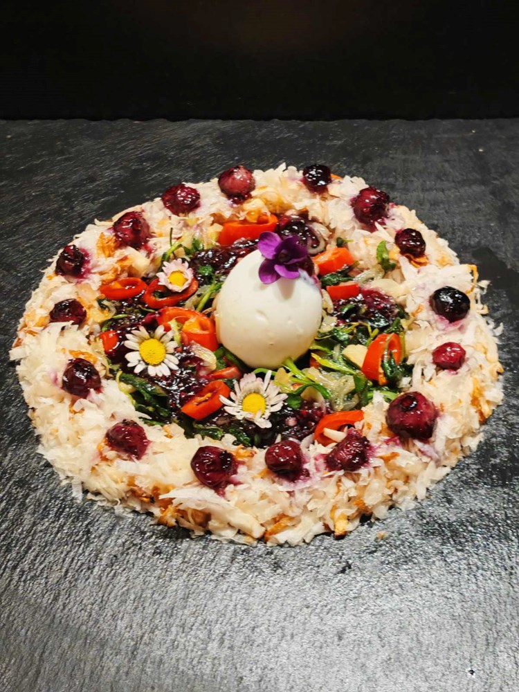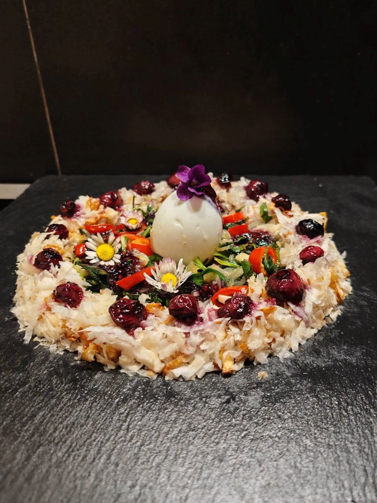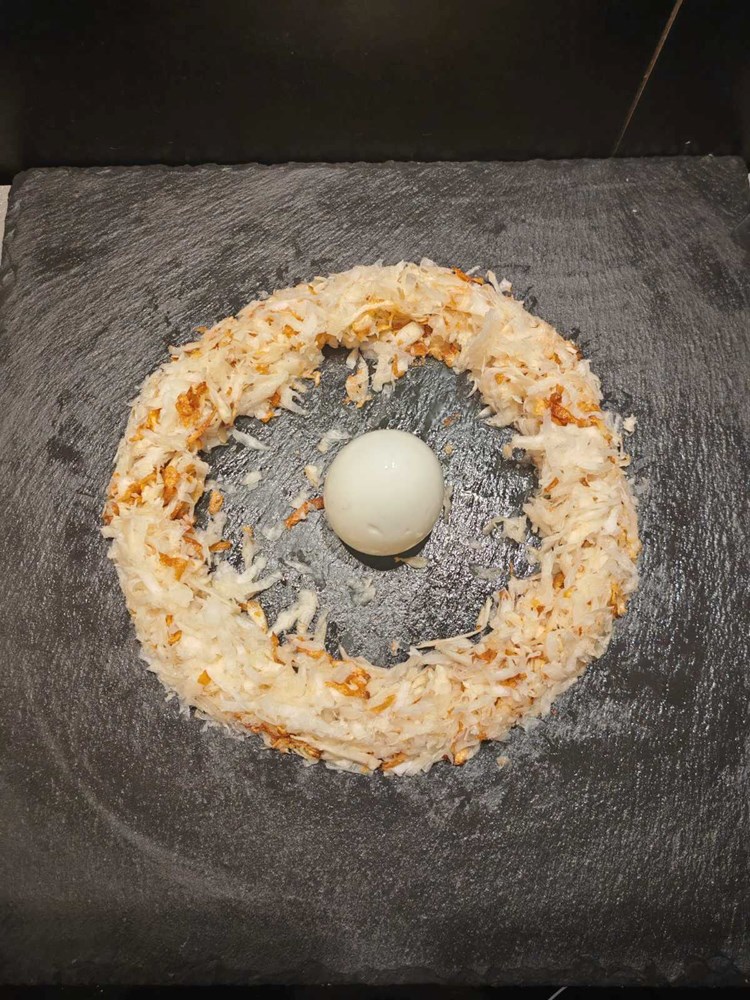 Izmiješani sirovi i prženi celer na velikom ravnom tanjuru poslažite u krug u obliku vijenca. Točno u sredinu vijenca postavite tvrdo kuhano jaje kojem ste predhodno uklonili ljusku. Okolo jaja unutar vijenca ispunite našim ukusnim varivom od tratinčice, ljubičice i ljutog feferona.