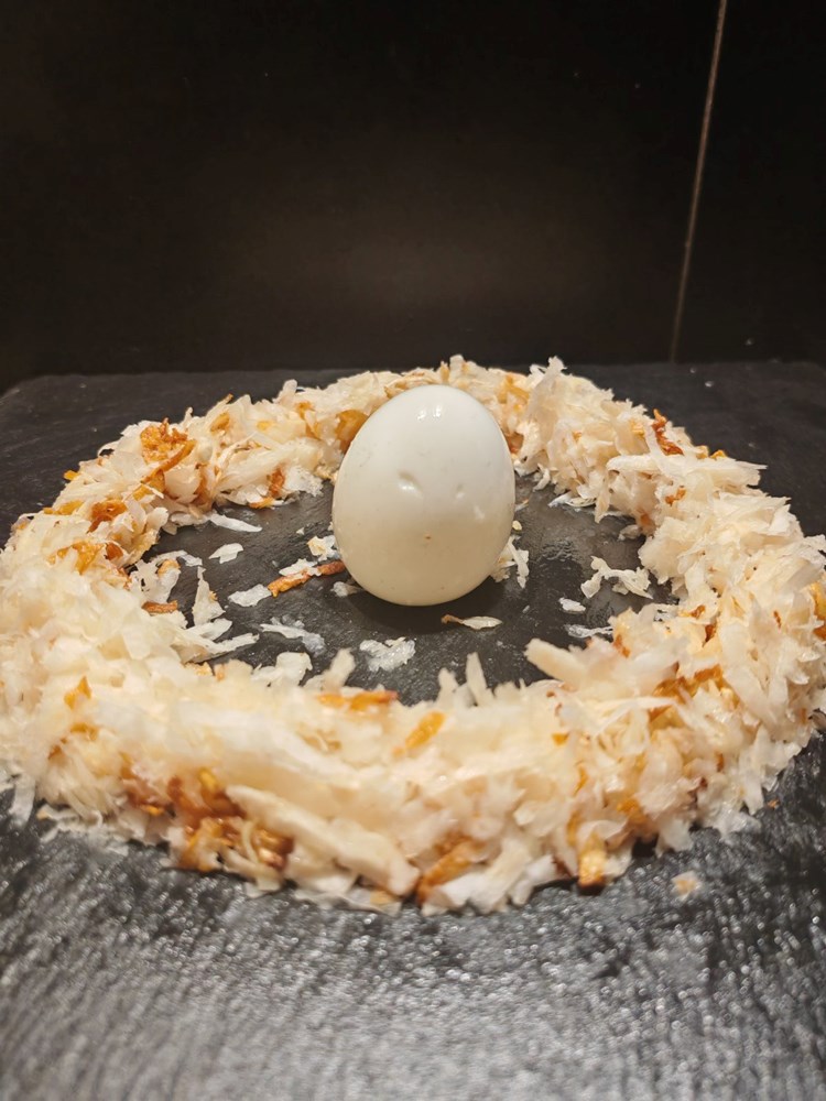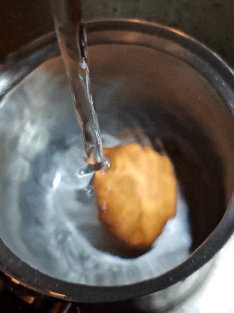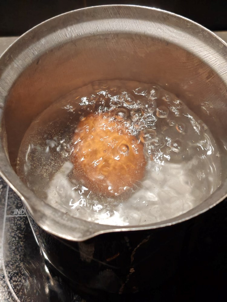 U manji lončić s kipućim vodom stavite jednu žlicu krupne morske ne jodirane soli, pa zatim ubacite jedno jaje da se kuha cca 4 minute. Po isteku vremena maknite lončić s jajem sa izvora topline pod mlaz hladne vode da se jaje naglo ohladi (vidi fotografiju).