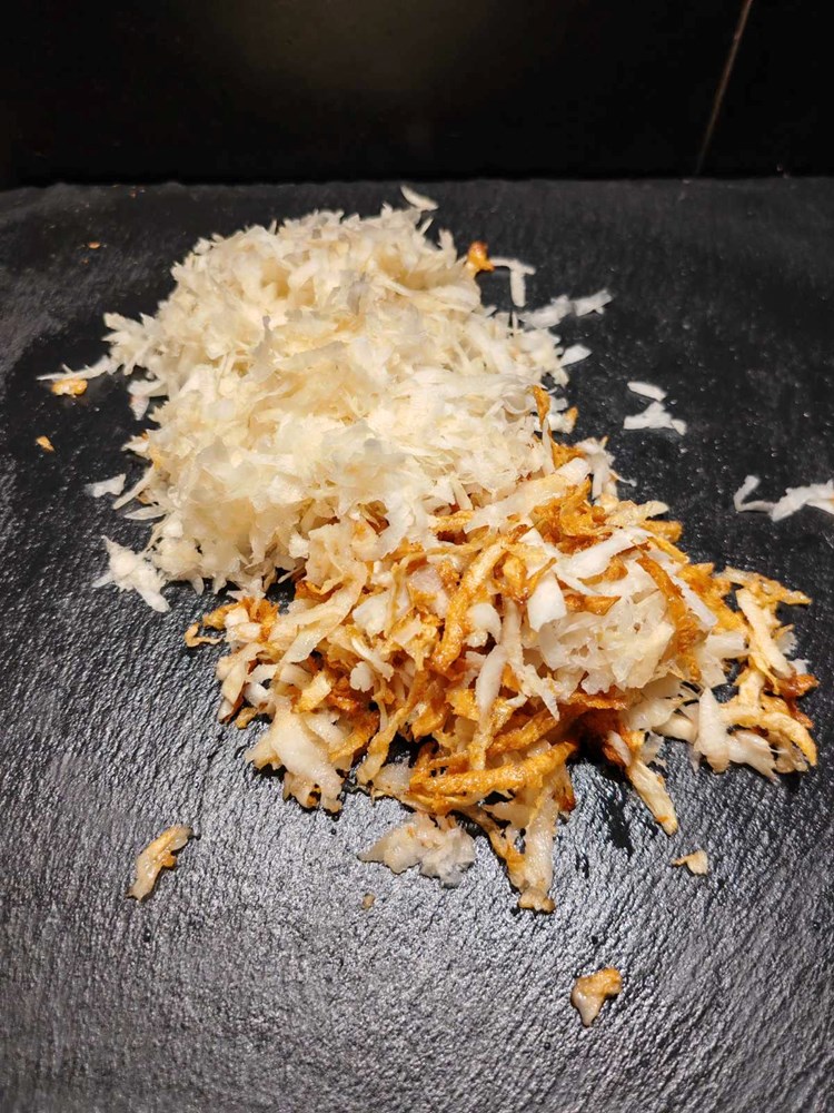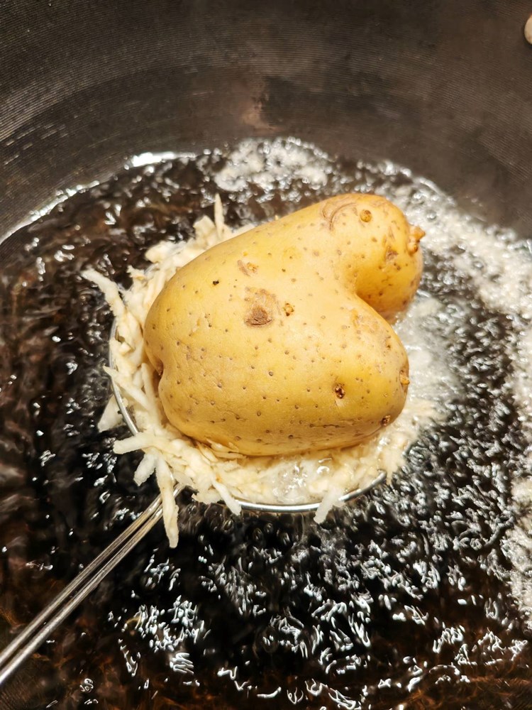 Tako posložen naribani celer s krumpirom stavite u duboku tavu u kipuće suncokretovo ulje nek se prži nekih 30 do maksimalno 40 sekundi pa ga maknite zatim iz ulja i ocijedite od viška ulja.