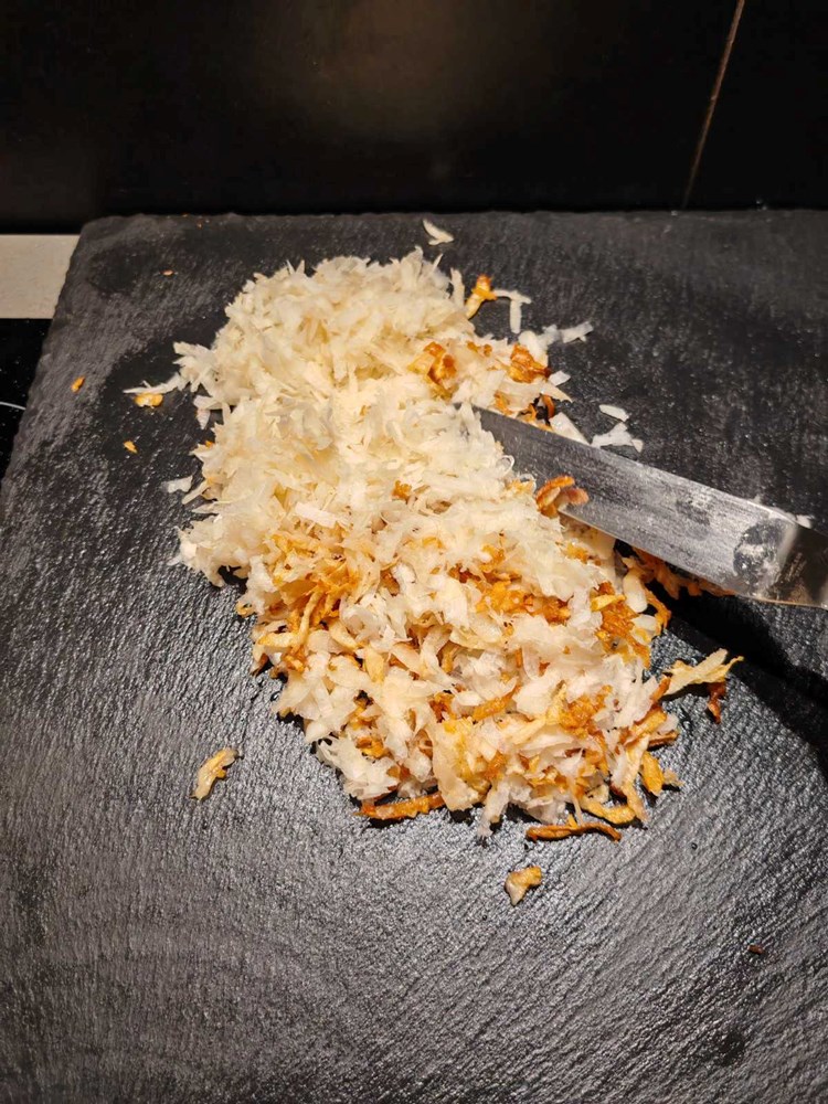 Od tih 20 dkg korijena celera, 10 dkg stavite u metalnu cjediljku i na celer u cjediljki stavite jedan manji sirovi krumpir (on će vam trebati da ispusti svoj "pommes " gušt i tim činom obogati aromu prženog celera = vidi fotografiju)