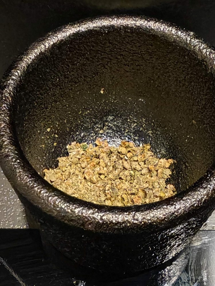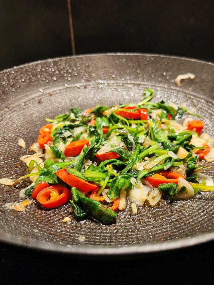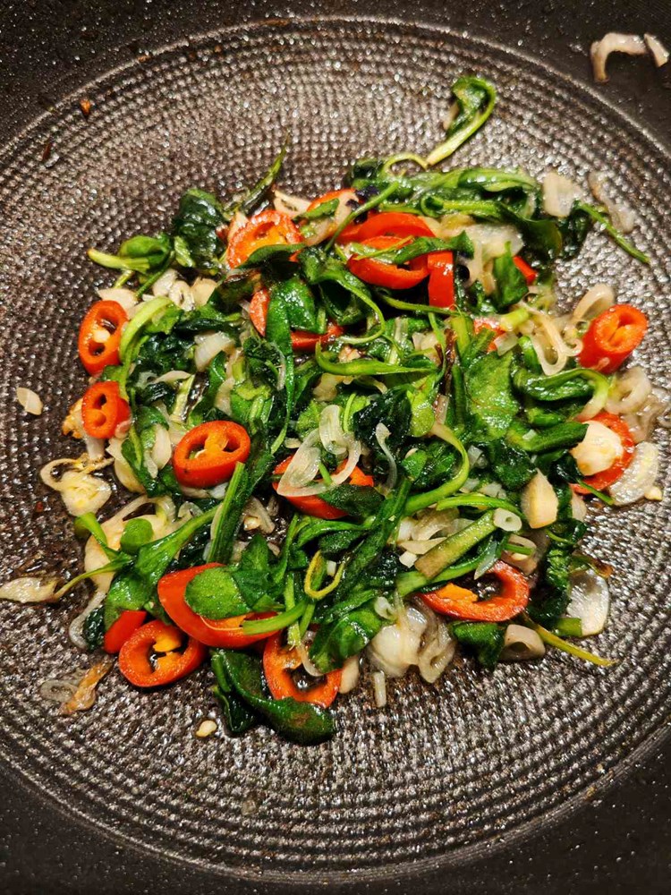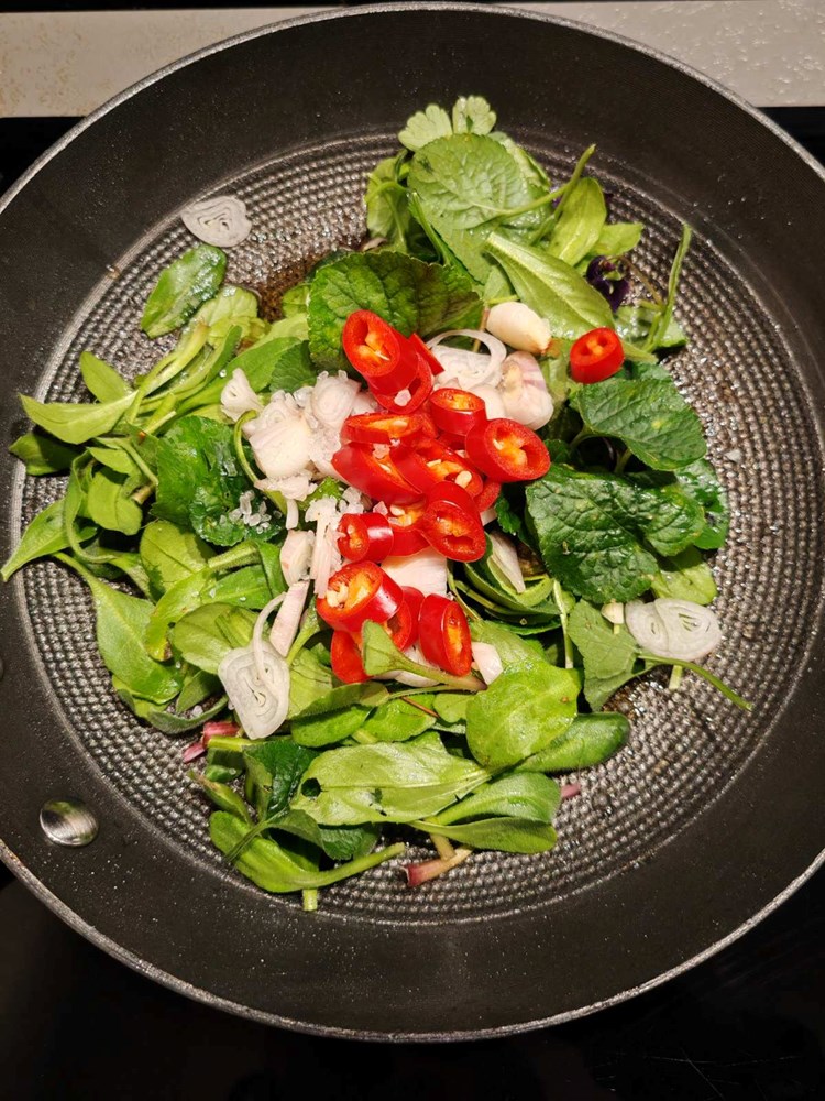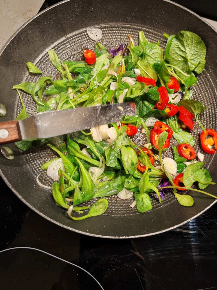 U manjoj tavi na vrelom maslinovom ulju stavite pržiti listove tratinčice, ljubičice, sitno nasjeckani luk ljutiku, i crveni ljuti feferon na kolutiće sa prstohvatom cvijeta morske soli. Sve pržite tri do četiri minute uz mješanje smo da sve u tavi omekša i da dobije strukturu variva. ( Vidi fotografiju)