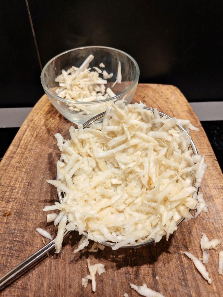 Ribežom na srednje rupice naribajte korijen celera (cca 20 ak dkg).