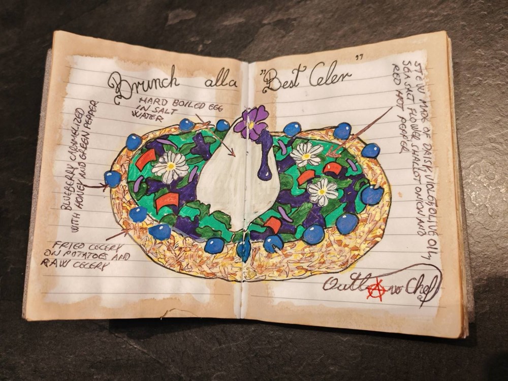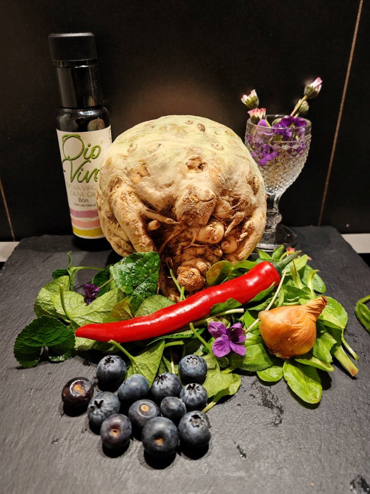 I dok se krećem prema svojoj kuhinji planiram: Na obližnjoj ću livadi naborati malo ljubičica i tratinčica pa ću i njih kombinirati u jelo. U frižideru mi rastu borovnice i frižider nese također kokošja jaja pa ću iskoristiti i jedno jaje. Odlučujem se da celer ima glavnu ulogu u ovom jelu.Njega ću kombinirati iz dvije različite priče. Jedan dio celera pržiti ću u dubokom suncokretovom ulju zajedno s krumpirom u komadu koji će pustiti svoj krumpirasti gušt pommesa u strukturu naribanog prženog celera a drugi ću dio samo sirovi naribati pa ću to sve zajedno izmiješati. Korijen celera pržen i hrskav, a ujedno mekan i sočan, sa svim osvježavajućim guštima koje eterika celera pruža.... Ostalo pogledajte u tekstu opisa jela....Dakle zaronimo skupa u ovo osvježavajuće i nesvakidašnje jelo ....