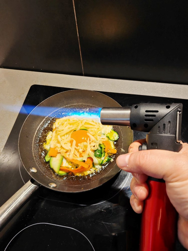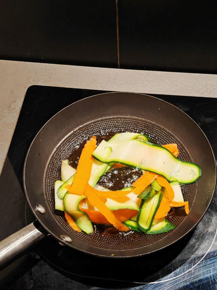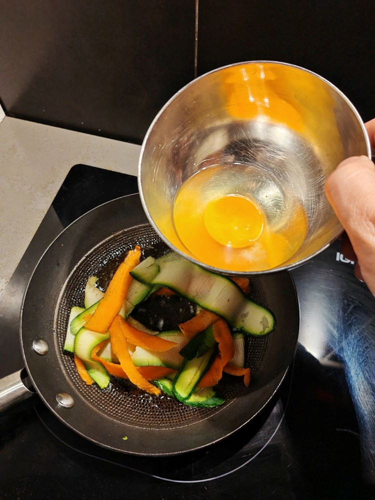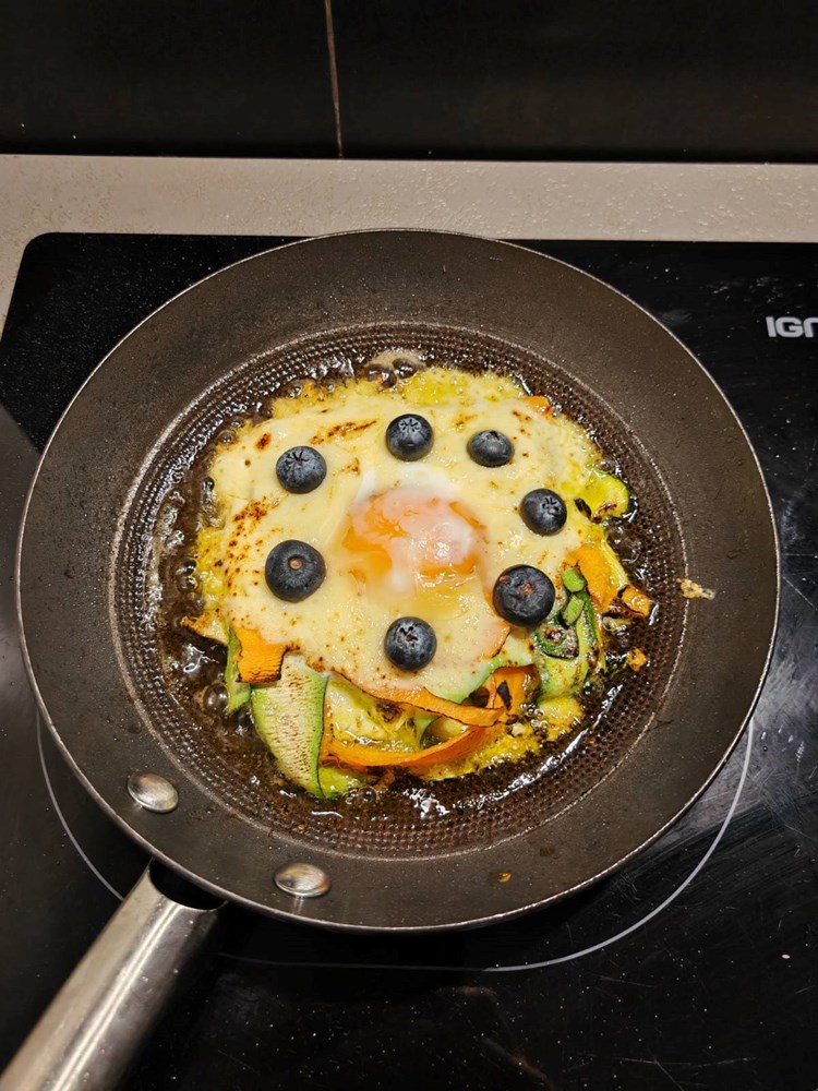 U manju plitku tavu na vrelom maslinovom ulju pržiti tikvicu i mrkvu narezanu na tanke ploške gulilicom za krumpir i posložene u oblik vijenca (vidi fotografiju). Nakon 30 ak sekundi u sredinu dodati "jaje na oko". Odmah zatim po bjelanjku jaja dok se prži poslagati u krug uokolo žumanjka naribani sir gaudu, pa zatim dodati 1/3 čajne žličice zelenog papra i 1/3 čajne žličice cvijeta morske soli. Uzeti džepni ili kuhinjski brener pa dok se odozdo prži na maslinovom ulju odozgo malo cca 2 do max 3 minute lagano pržiti plamenom brenera čisto da sir, tikvica i mrkva dobiju smeđkaste tonove. Nakon cca 3.5 do 4.5 minuta prženja maknuti tavu s izvora topline.