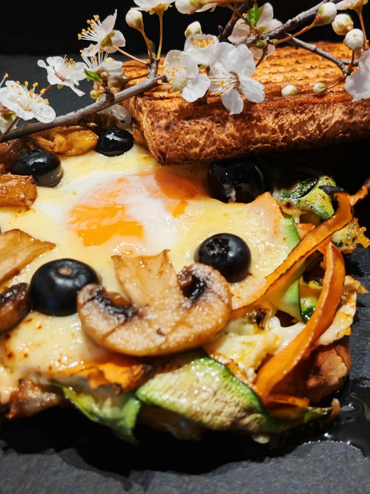 Slaganje tosta: Na donju fetu istostiranog kruha stavite uz pomoć velike servisne žlice "vijenac" od tikvice, mrkve, jaja kojeg ste pržili na maslinovom ulju. Poslažite zatim ploškice prženih šampinjona po rastopljenom siru, a između stavite bobice svježe borovnice. Borovnica će ovoj kombinaciji slatkasto slankastih okusa jaja, tikvice, šampinjona i mrkve dati ton dodatne svježine i prouzročiti blagi prividni efekt "petog okusa" umamija na vašem cijenjenom nepcu. Dobar vam tek, dragi čitatelji... Vaš Outlaw.