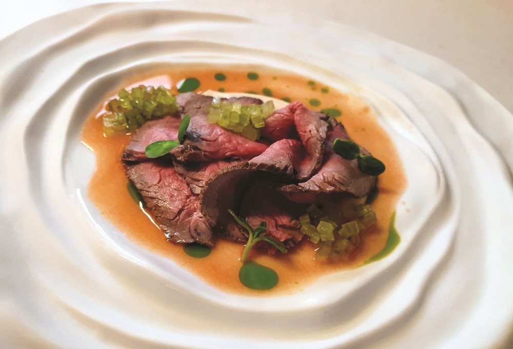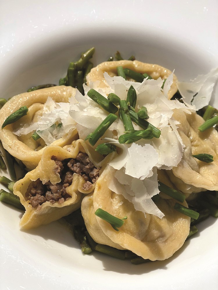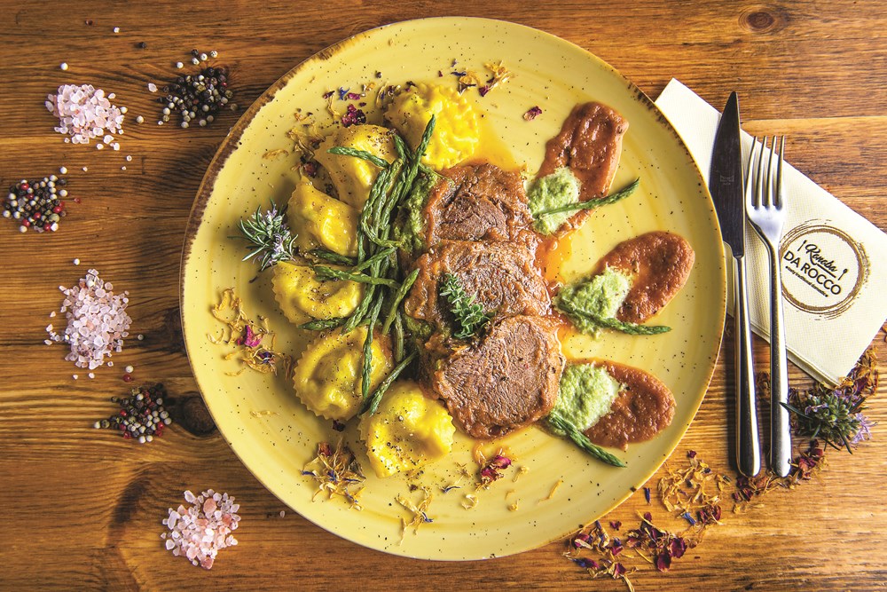 Meso boškarina izrezano na fete poslužimo s raviolima i šugom od povrća i šparoga.