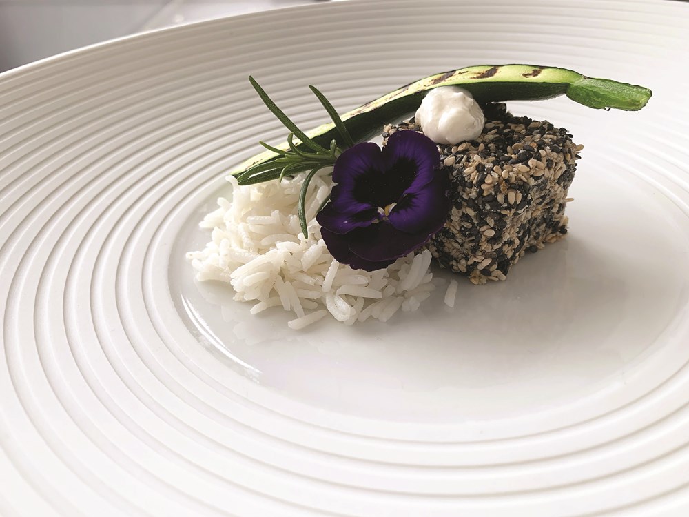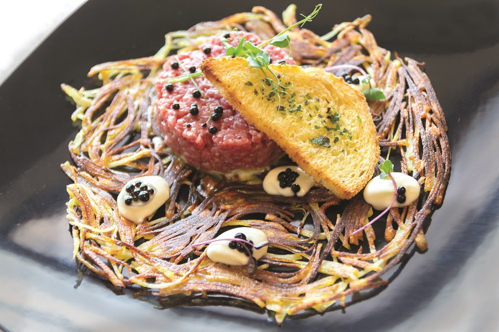 Na pizzettu od krumpira stavimo majonezu od jabuke pa na nju oblikovani tartar od boškarina s bruschettom od kukuruznog kruha. Nadodamo perlice te mikro bilje.