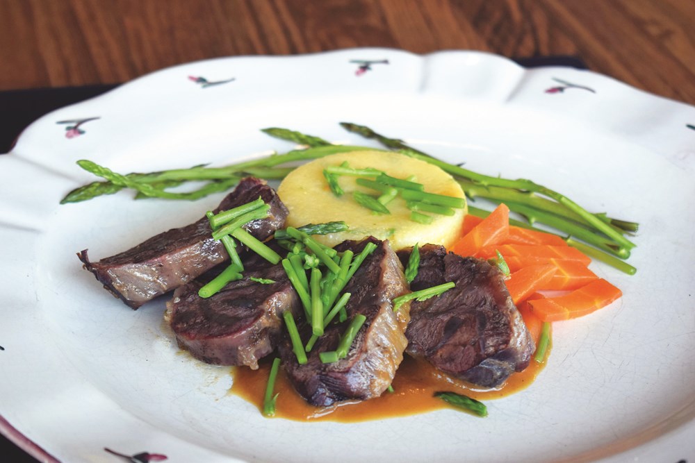 Meso u komadu začiniti sa soli i paprom, te zapeći u pećnici na visokoj temperaturi. Kad meso dobije koricu (oko 15 minuta), smanjiti temperaturu na 160 stupnjeva Celzija, pokriti meso alu-folijom te peći oko 2 sata. Povremeno politi temeljcem i okrenuti. Luk i mrkvu nasjeckati na komade i peći zajedno s mesom. Dodati par grančica ružmarina i bosiljak. Kad je meso dovoljno mekano, izvaditi iz pleha, a povrće ispasirati da se dobije gusti umak. Palentu skuhati i umiješati šačicu šparoga na kraju kuhanja.