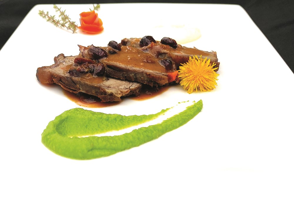 Pečeni komad mesa izrezati na odreske, servirati ih na umaku od brusnice. Poslužiti uz prilog od graška i celera.