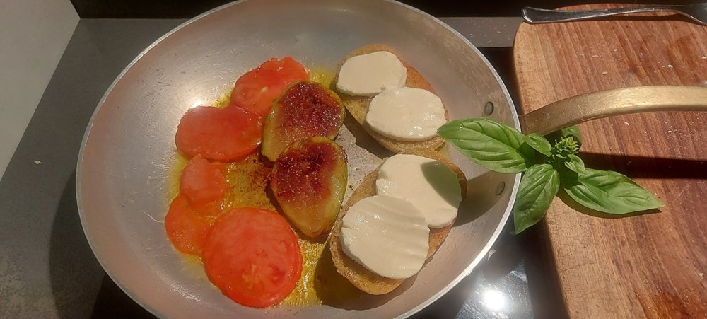 Sve to lagano zapržiti na vrelome maslinovom ulju, smokvu prvo zapržite na polovicama gdje se nalazi njeno meso. Kada, pecivo, smokva i pomidor dobiju smećkastu koricu, maknite ih s izvora topline.