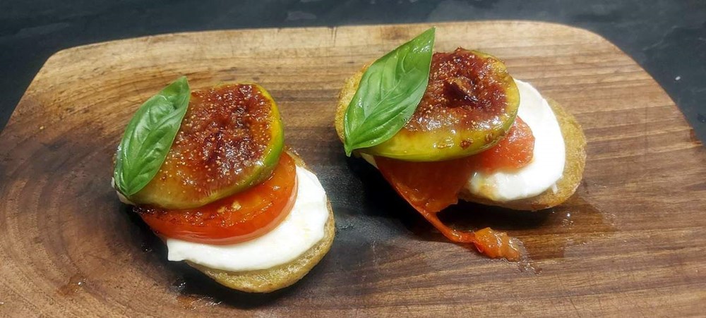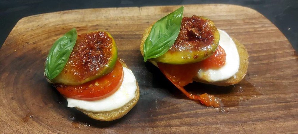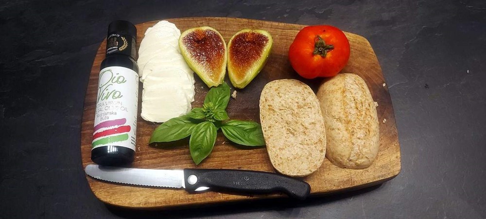 Dok je pecivo još toplo odmah stavite na njega fetu mozzarelle pa fetu vrelog pomidora, a na pomidor stavite vruću smokvu.