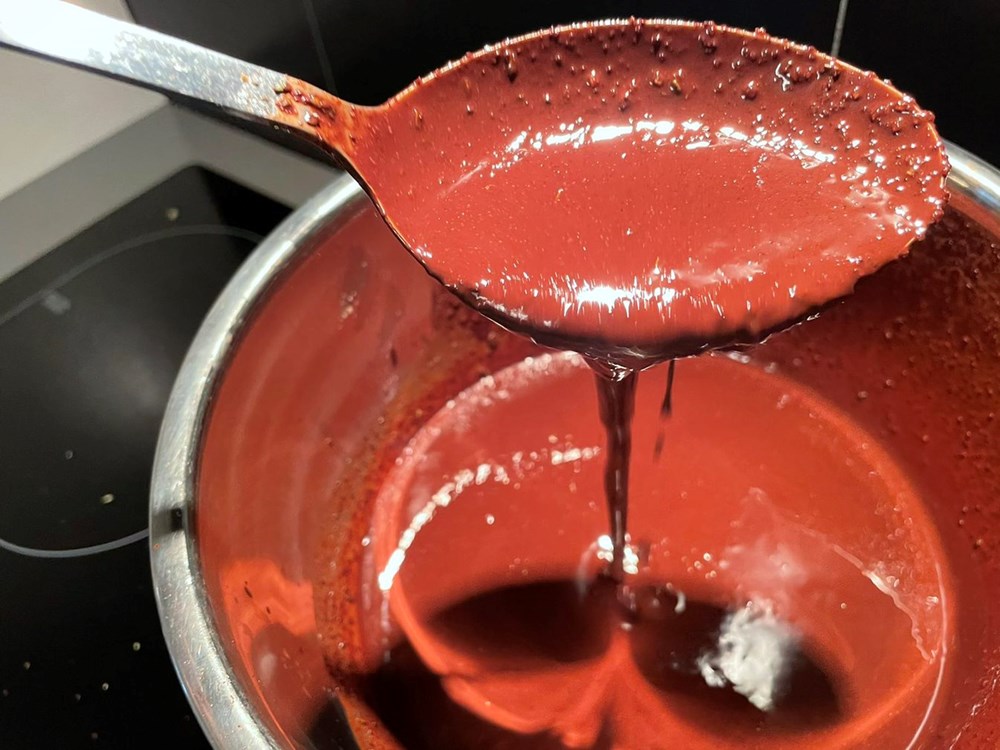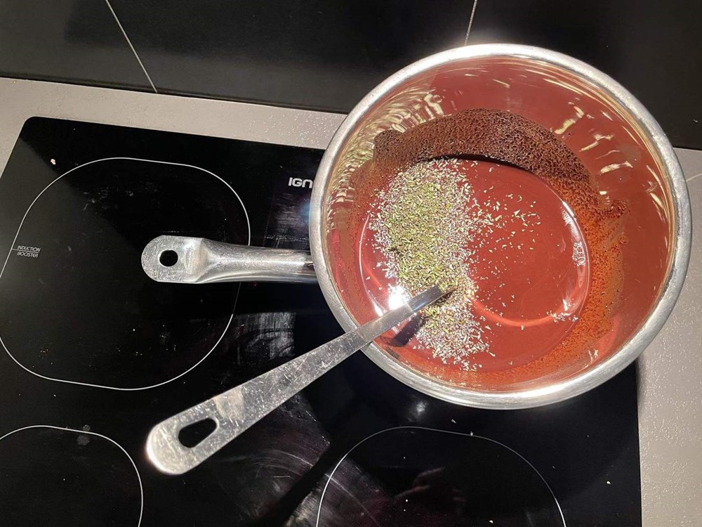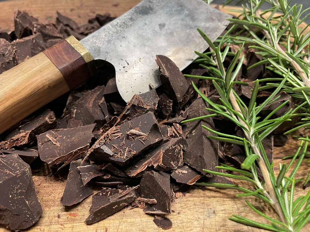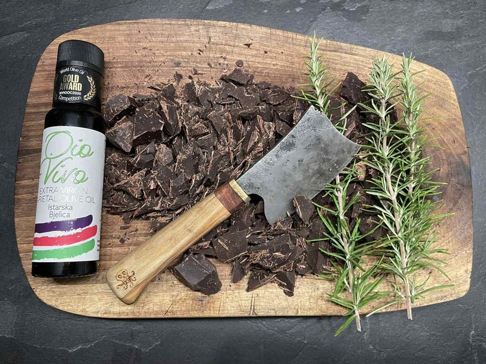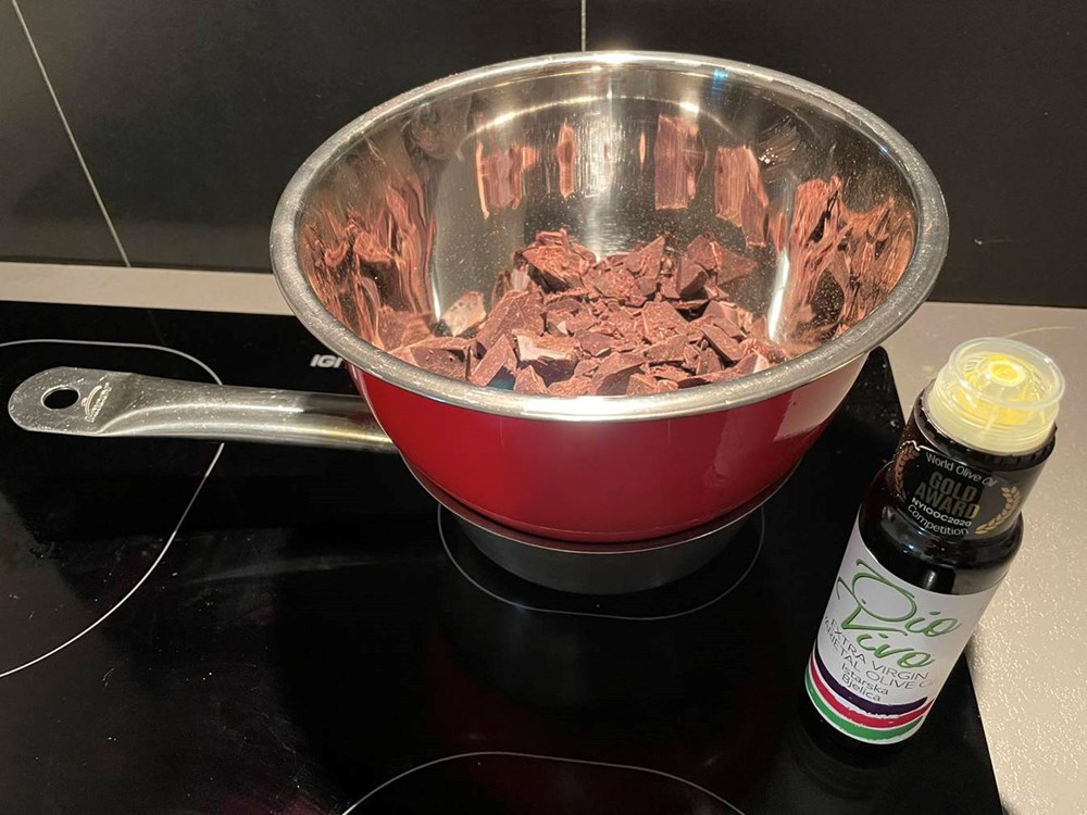 Kada se čokolada unutar metalne zdjele počne topiti konstantno i lagano miješajte velikom žlicom i dodajte 1,5 dcl maslinovog ulja... miješajte... kada se ulje stopi s čokoladom tvoreći konstantnu gustu smjesu dodajte sitno nasjeckani ružmarin... miješajte... kada se sitno nasjeckani ružmarin sjedini sa smiješkom topljene čokolade i maslinovog ulja dodajte 4 jušne žlice meda... miješajte... kada se med sjedini sa čokoladnom smjesom, zdjelu maknite s vatre i s lonca... i dalje miješajte.